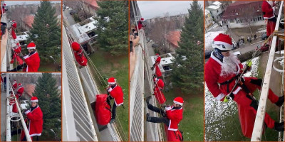 Mališani koji se leče na Dečjem odeljenju pirotske bolnice danas su doživeli nesvakidašnje iznenađenje kada su pripadnici Gorske službe spasavanja u odorama Deda Mraza dostavili paketiće spuštajući se konopcima sa krova bolnice.
