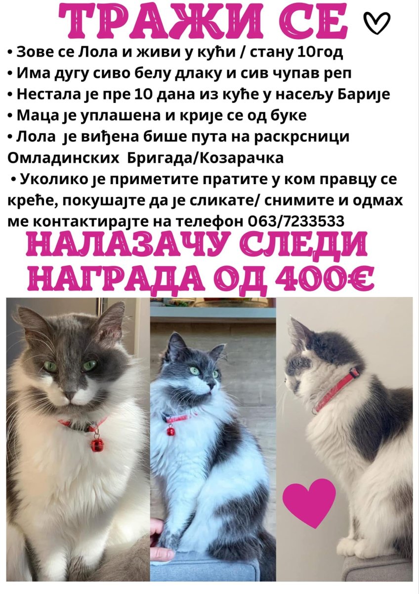 Za njen povratak vlasnici su udvostručili nagradu i nude nalazaču 400 evra! Ako ste je videli ili imate bilo kakvu informaciju, javite se odmah! Svaka pomoć je dragocena! - poručuju vlasnici.