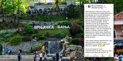 - Imam vaučere za Vrnjačku Banju koje mogu da iskoristim do kraja februara i rezervaciju od 23. do 28. februara u vili "Kraljica". Pet prenoćišta su besplatna, a moguće je dobiti i šesto uz doplatu od 2.000 dinara. Osoba sa kojom je trebalo da idem tamo je sprečena, pa mi za taj odmor treba ženska osoba od 20 do 45 godina. Imamo besplatan smeštaj i hranu, tri obroka dnevno, s tim što planiram da idemo i na bazen u drugom objektu (verovatno ne svakog dana, videćemo) - piše on.