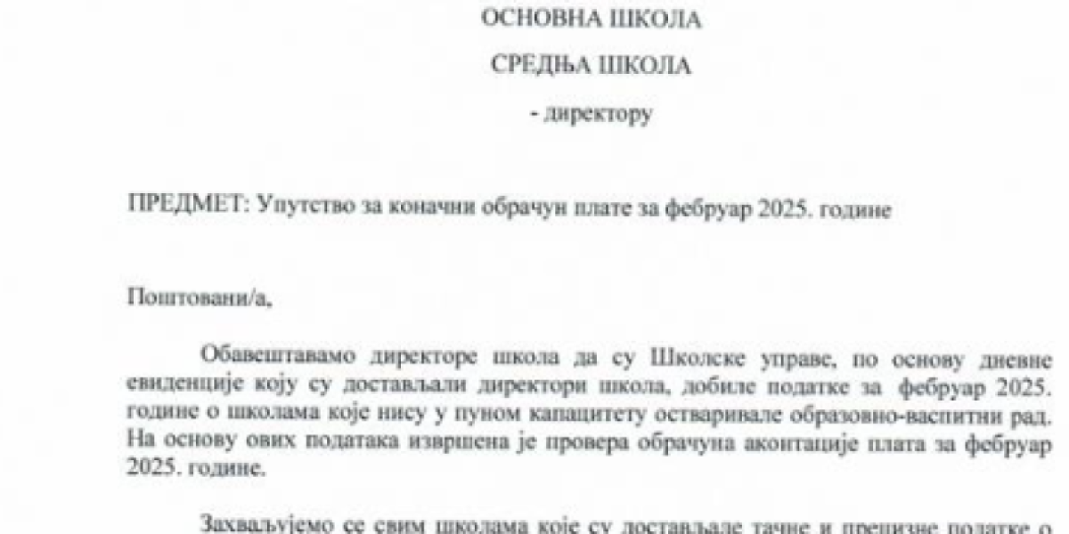 Juče su direktori škola obavešteni da su školske uprave dobile podatke za februar 2025, o školama koje nisu u punom kapacitetu obavljale vaspitno-obrazovni rad.