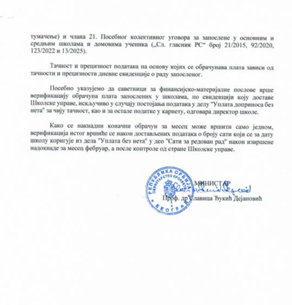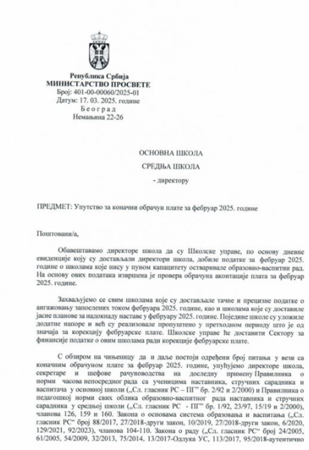- S obzirom na činjenicu da i dalje postoji određeni broj pitanja u vezi sa konačnim obračunom plate za februar 2025. godine, upućujemo direktore škola, sekretare i šefove računovodstva na doslednu primenu Pravilnika o normi časova neposrednog rada sa učenicima nastavnika, stručnih saradnika i vaspitača u osnovnoj školi („Sl. glasnik RS — PG” br. 2/92 i 2/2000) i Pravilnika o pedagoškoj normi svih oblika obrazovno-vaspitnog rada nastavnika i stručnih saradnika u srednjoj školi („Sl. glasnik RS – PG” br. 1/92, 23/97, 15/19 i 2/2000), članova 126, 159 i 160. Zakona o osnovama sistema obrazovanja i vaspitanja („Sl. glasnik RS” broj 88/2017, 27/2018-drugi zakon, 10/2019, 27/2018-drugi zakon, 6/2020, 129/2021, 92/2023), članova 104-110. Zakona o radu („Sl. glasnik RS” broj 24/2005, 61/2005, 54/2009, 32/2013, 75/2014, 13/2017-Odluka us, 113/2017, 95/2018-autentično tumačenje) i člana 21. Posebnog kolektivnog ugovora za zaposlene u osnovnim i srednjim školama i domovima učenika („Sl. glasnik RS” broj 21/2015, 92/2020, 123/2022 i 13/2025) - stoji u dopisu Ministarstva prosvete.