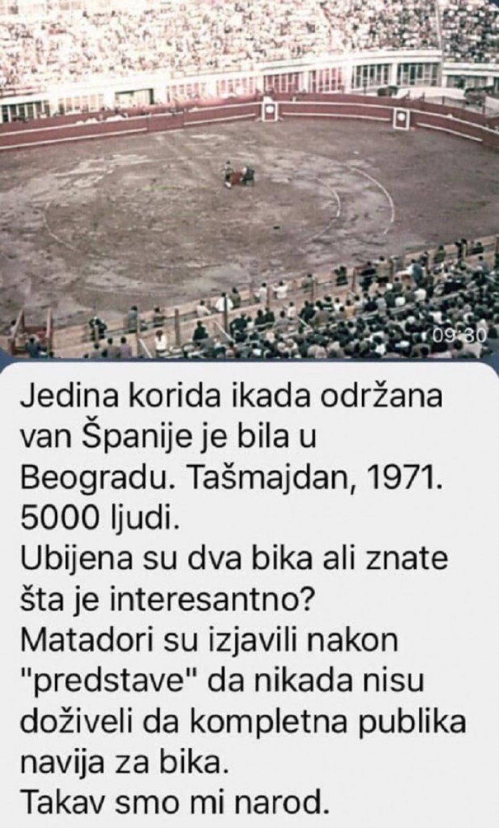 - Jedina korida ikada održana van Španije je bila u Beogradu. Tašmajdan, 1971. 5000 ljudi. Ubijena su dva bika ali znate šta je interesantno? Matadori su izjavili nakon "predstave" da nikada nisu doživeli da kompletna publika navija za bika. Takav smo mi narod - glasi objava na mrežama.
