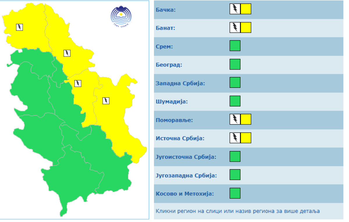 Na teritoriji Bačke, Banata, Pomoravlja i istočne Srbije danas je na snazi žuti meteoalarm zbog grmljavine.