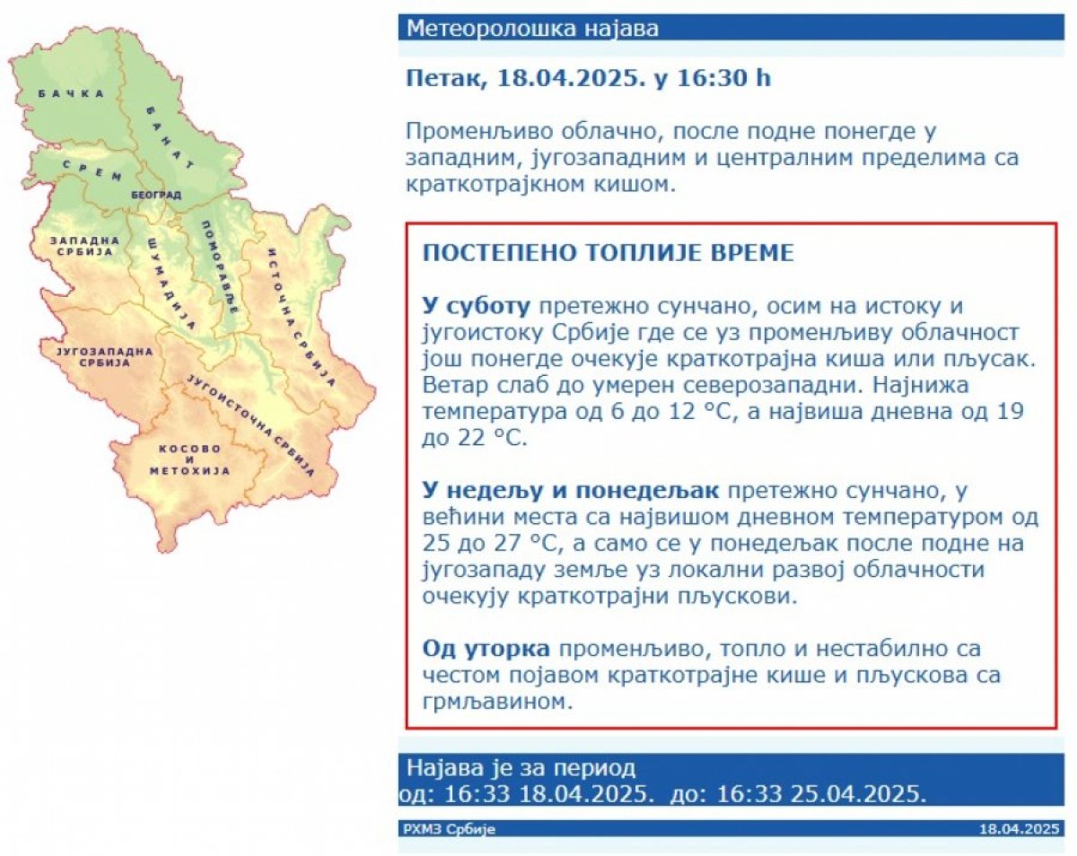 Kako su rekli iz RHMZ-a, posle podne ponegde u zapadnim, jugozapadnim i centralnim predelima sa kratkotrajnom kišom očekuje se promenljivo oblačno vreme.