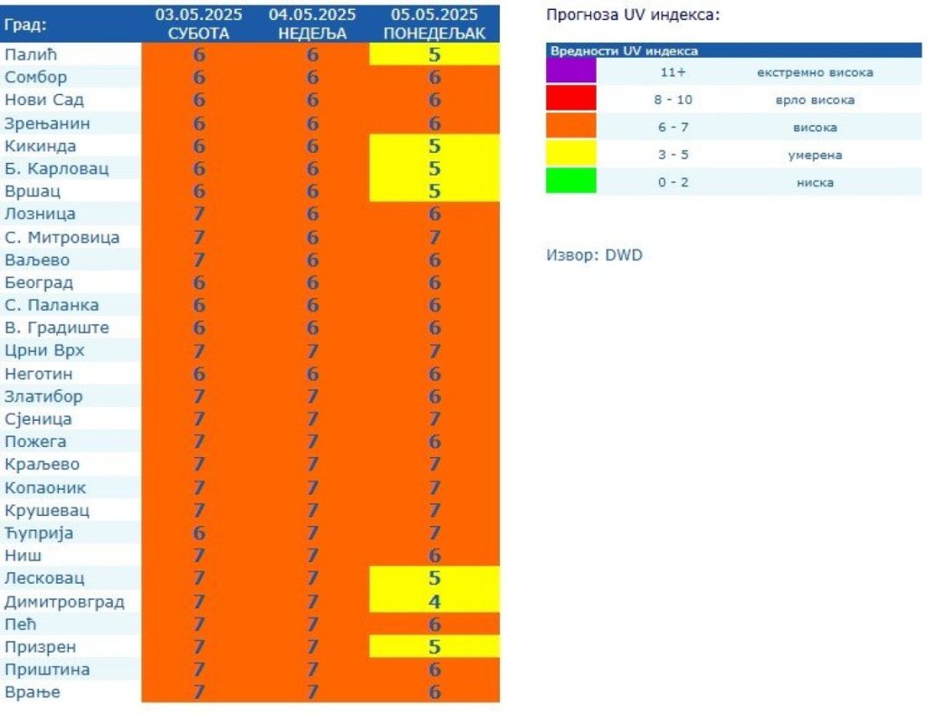 Najviši UV indeks, prema RHMZ, u Srbiji danas je zabeležen u Loznici, Sremskoj Mitrovici, Valjevu, Crnom Vrhu, Zlatiboru, Sjenici, Požegi, Kraljevu, Kopaoniku, Kruševcu, Nišu, Leskovcu, Dimitrovgradu, Prizrenu, Prištini i Vranju, i to na vrednosti 7, dok je u ostalim gradovima za jedinicu niži.