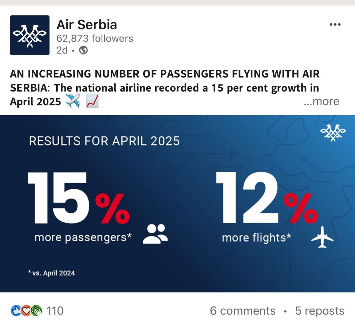 - Rezultati koje smo videli od početka godine, posebno u aprilu tokom uskršnjih praznika, još jednom potvrđuju da Er Srbija uspešno odgovara na rastuću potražnju i da smo na pravom putu da dalje proširimo našu mrežu i poboljšamo našu uslugu. Ponosni smo na rad i posvećenost celog tima. Spremni smo za dodatne letove i nove destinacije tokom letnje sezone, sa namerom da obezbedimo efikasnu i udobnu vezu za još više putnika sa ključnim gradovima u Evropi, Mediteranu, Aziji i Severnoj Americi - jasan je bio Marik.