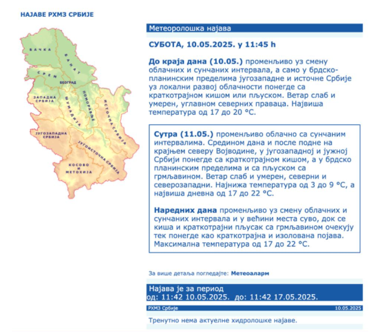 Sutra (11.05.) promenljivo oblačno sa sunčanim intervalima. Sredinom dana i posle podne na krajnjem severu Vojvodine, u jugozapadnoj i južnoj Srbiji ponegde sa kratkotrajnom kišom, a u brdsko planinskim predelima i sa pljuskom sa grmljavinom. Vetar slab i umeren, severni i severozapadni. Najniža temperatura od 3 do 9, a najviša dnevna od 17 do 22 stepeni.