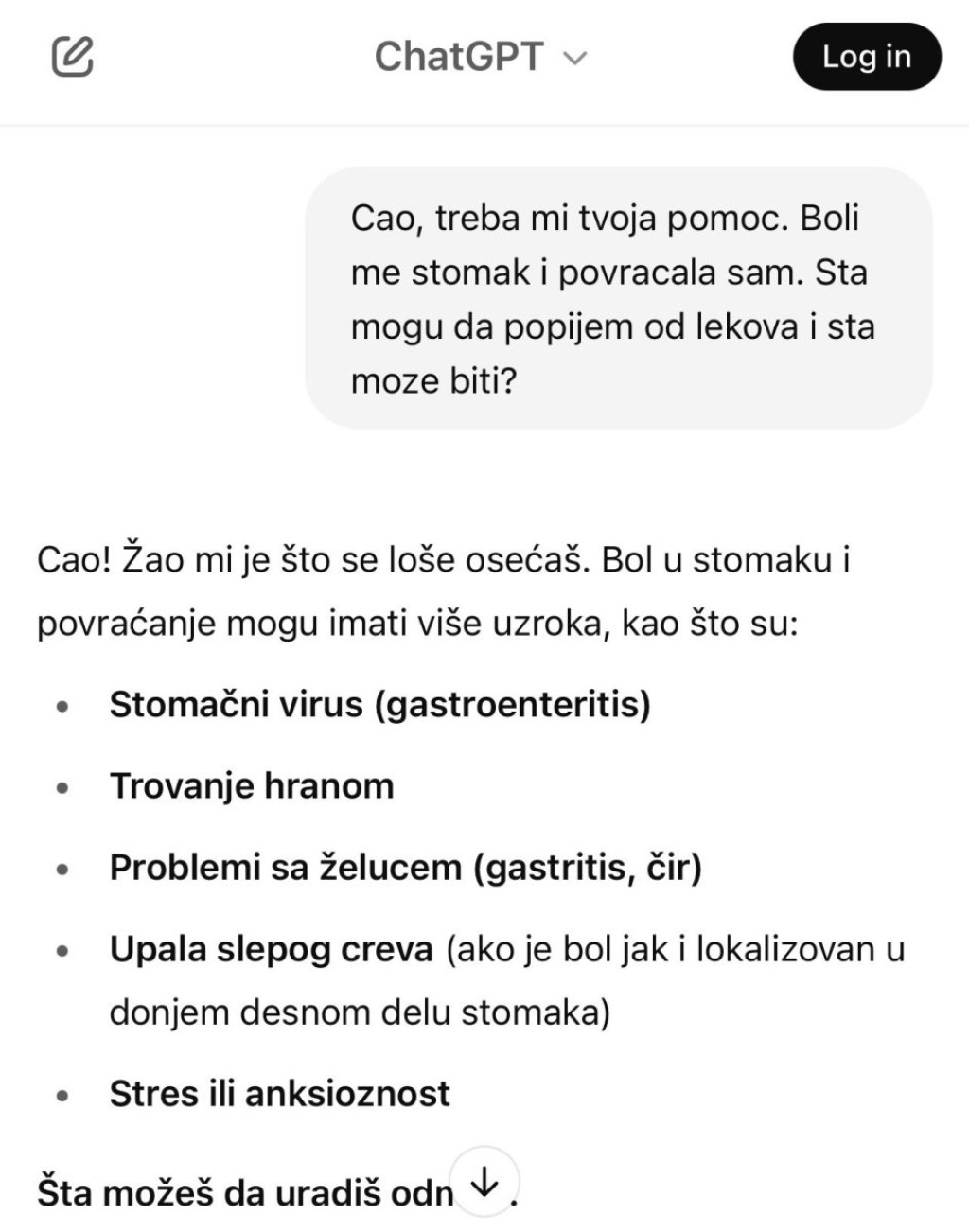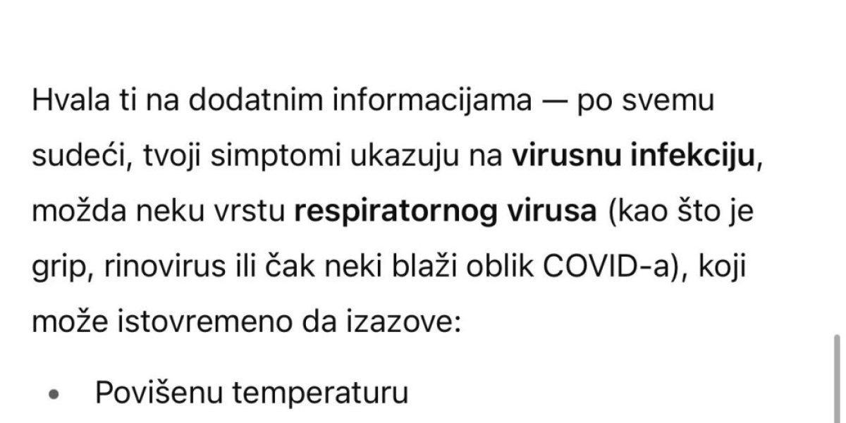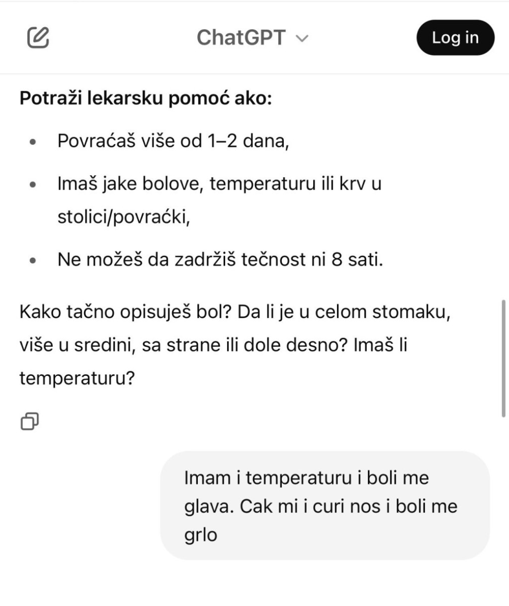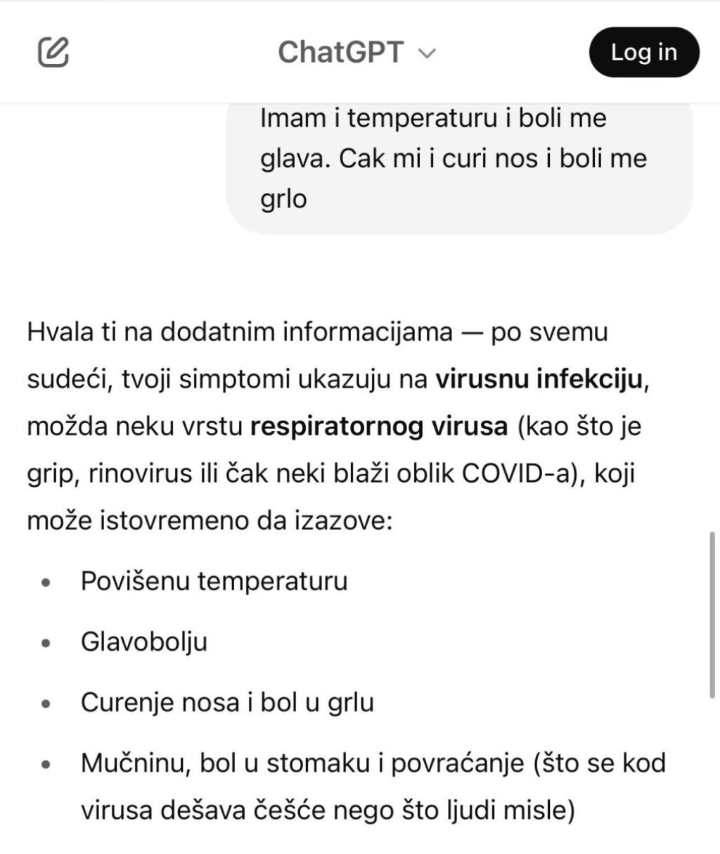 Kada u ChatGPT unesete svoje simptome, on će vam izneti niz zdravstvenih problema koje isti nose sa sobom, ali i dati savet kako to da prevaziđete, ukoliko mu zatražite i tu uslugu.