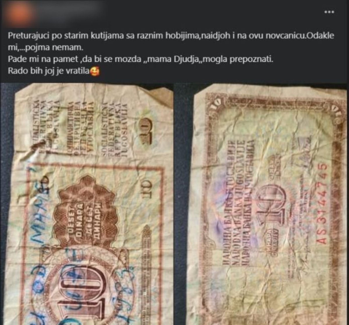 Jedna Srpkinja je u Fejsbuk grupi "Novosađanke" postavila sliku novčanice od 10 dinara, iz 1983. godine, koju je rešila da vrati ženi, koja je na njoj, pre 42 godine, napisala jednu poruku.