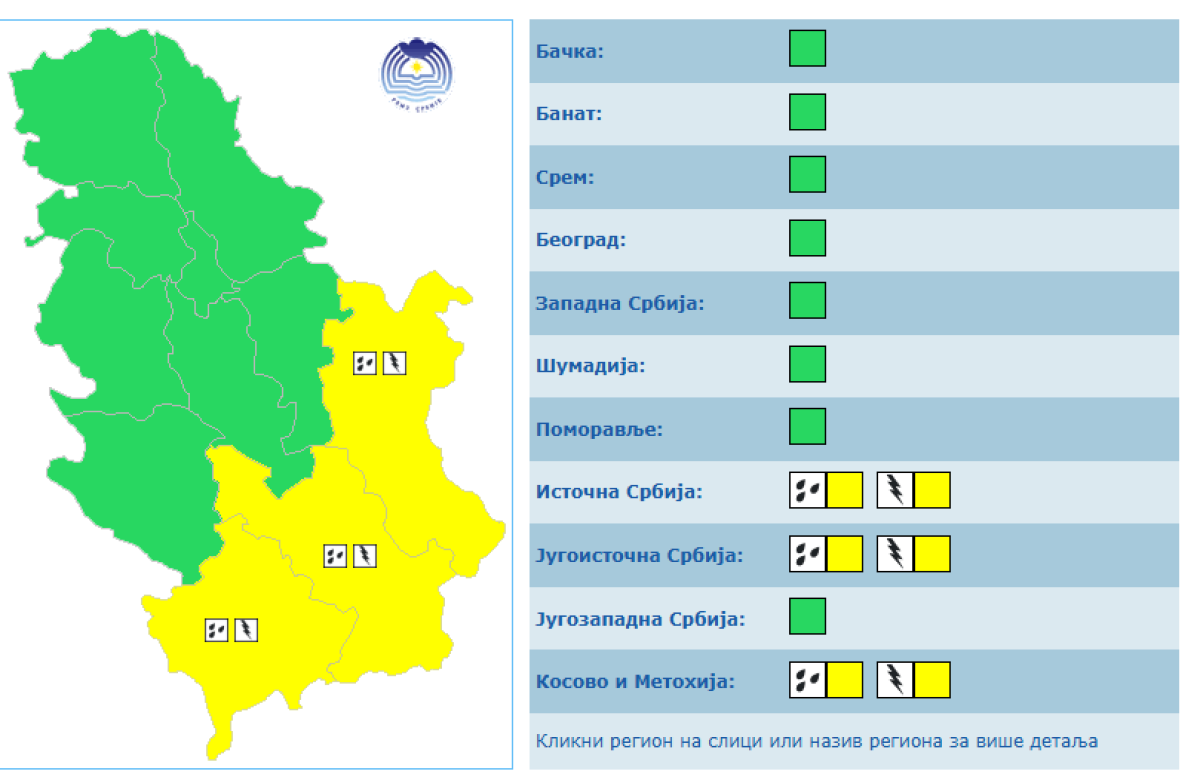 Tokom celog dana na snazi će biti žuti meteoalarm i to na teritoriji istočne i jugoistočne Srbije, kao i Kosova i Metohije zbog pljuskova i grmljavine.