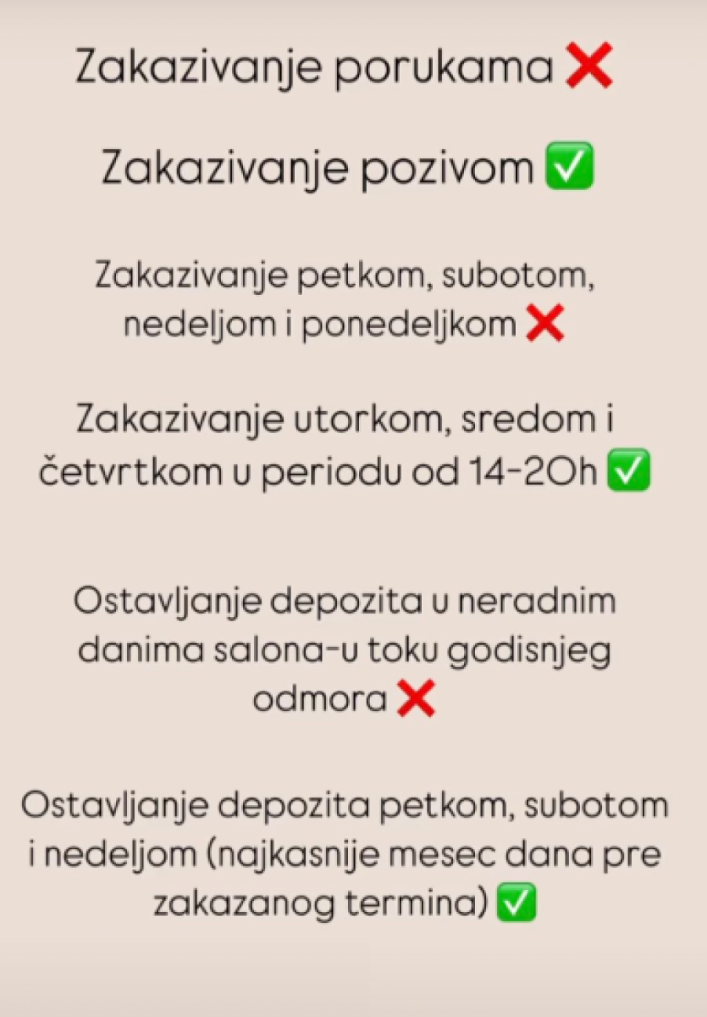 Takođe, ne možete zakazivati termin kako vi želite, niti možete ostavljati kaparu tj. depozit onda kada vama odgovara već striktno propisanim danima.