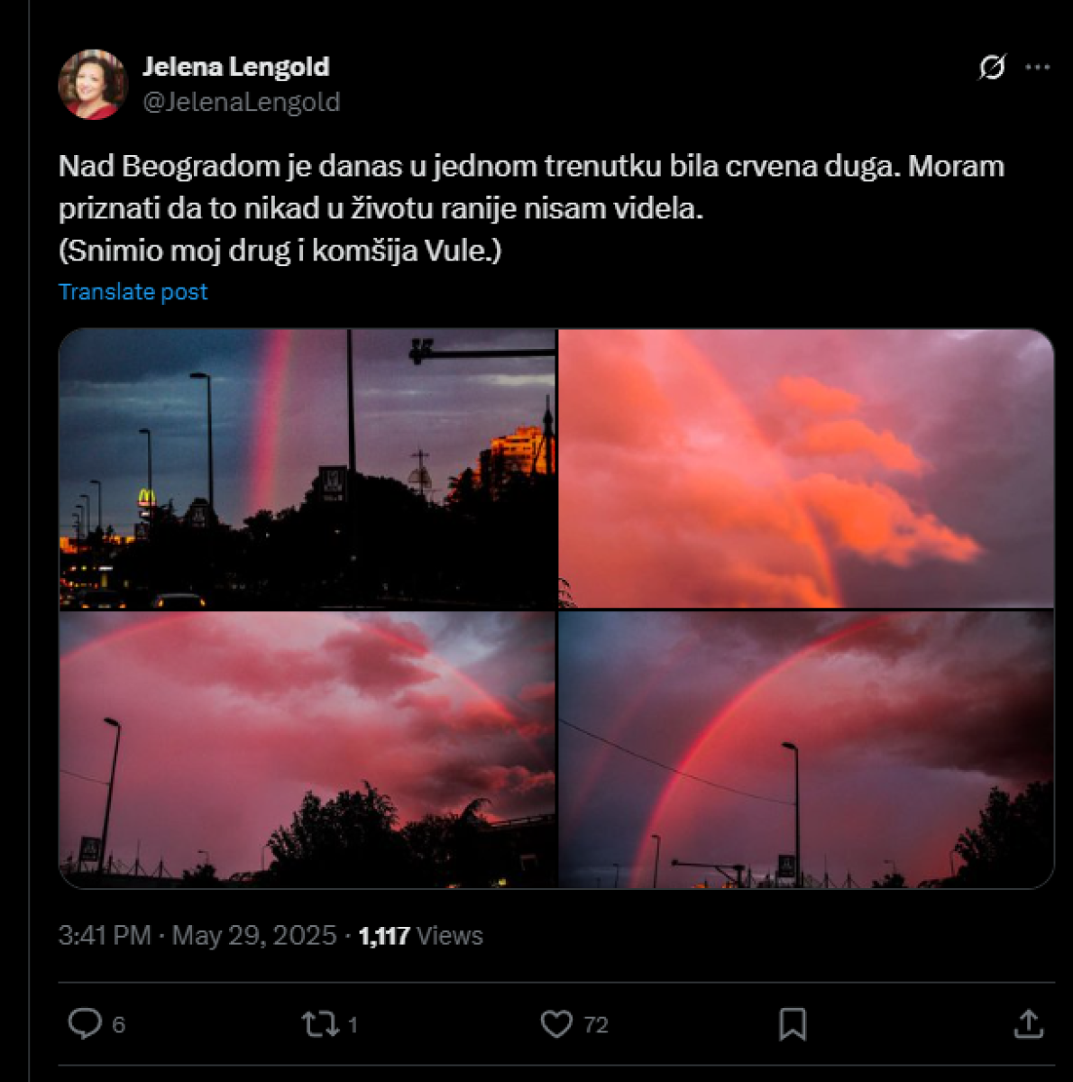 - Nad Beogradom je danas u jednom trenutku bila crvena duga. Moram priznati da to nikad u životu ranije nisam videla - napisala je jedna Beograđanka