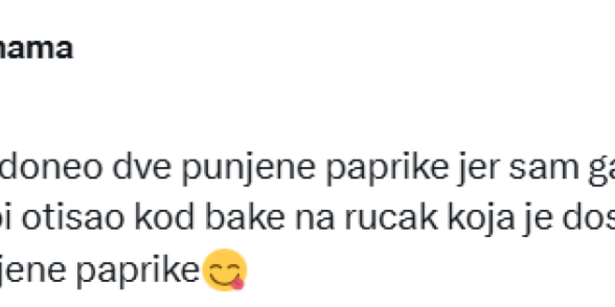 "Učenik mi je doneo dve punjene paprike jer sam ga pustila 15 minuta ranije sa časa da bi stigao na ručak kod bake, koja je došla iz Leskovca i spremila baš te paprike za njega" napisala je profesorka.