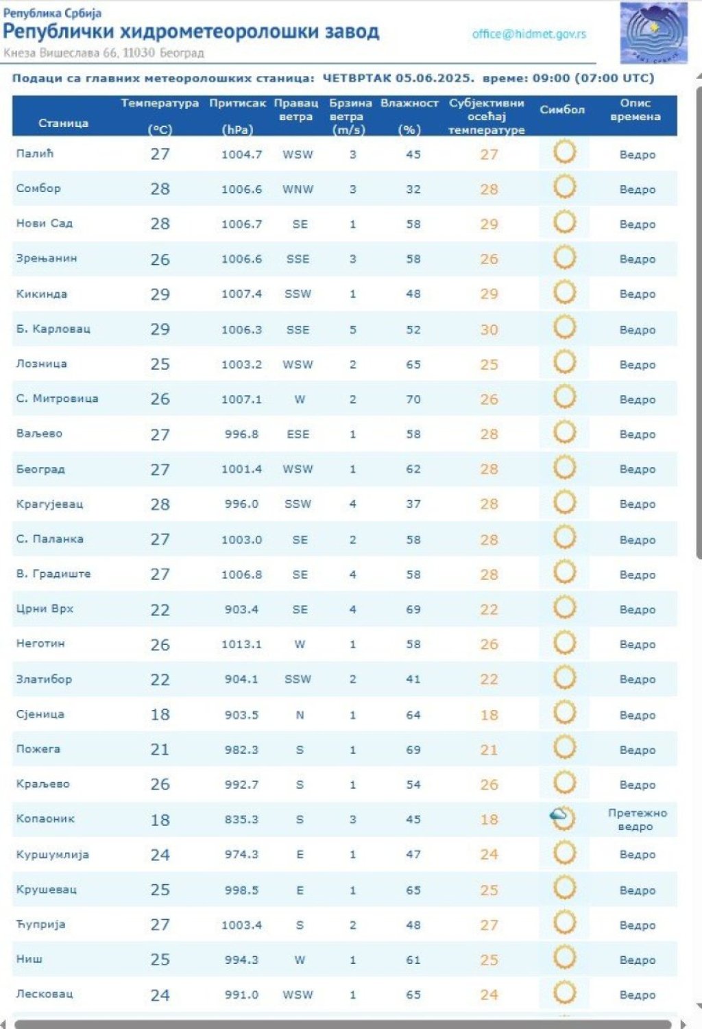 Prema izveštaju RHMZ, jutros su se merenja kretala od 21 do čak 29 stepeni, a najtopliji gradovi u 9 časova bili su Kikinda i Banatski Karlovci.