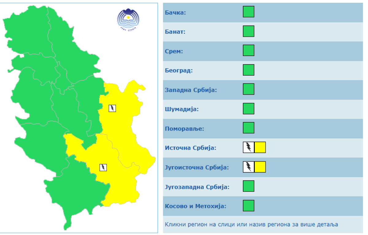 Na teritoriji jugoistočne i jugozapadne Srbije na snazi tokom celog dana biće žuti meteoalarm zbog grmljavine.
