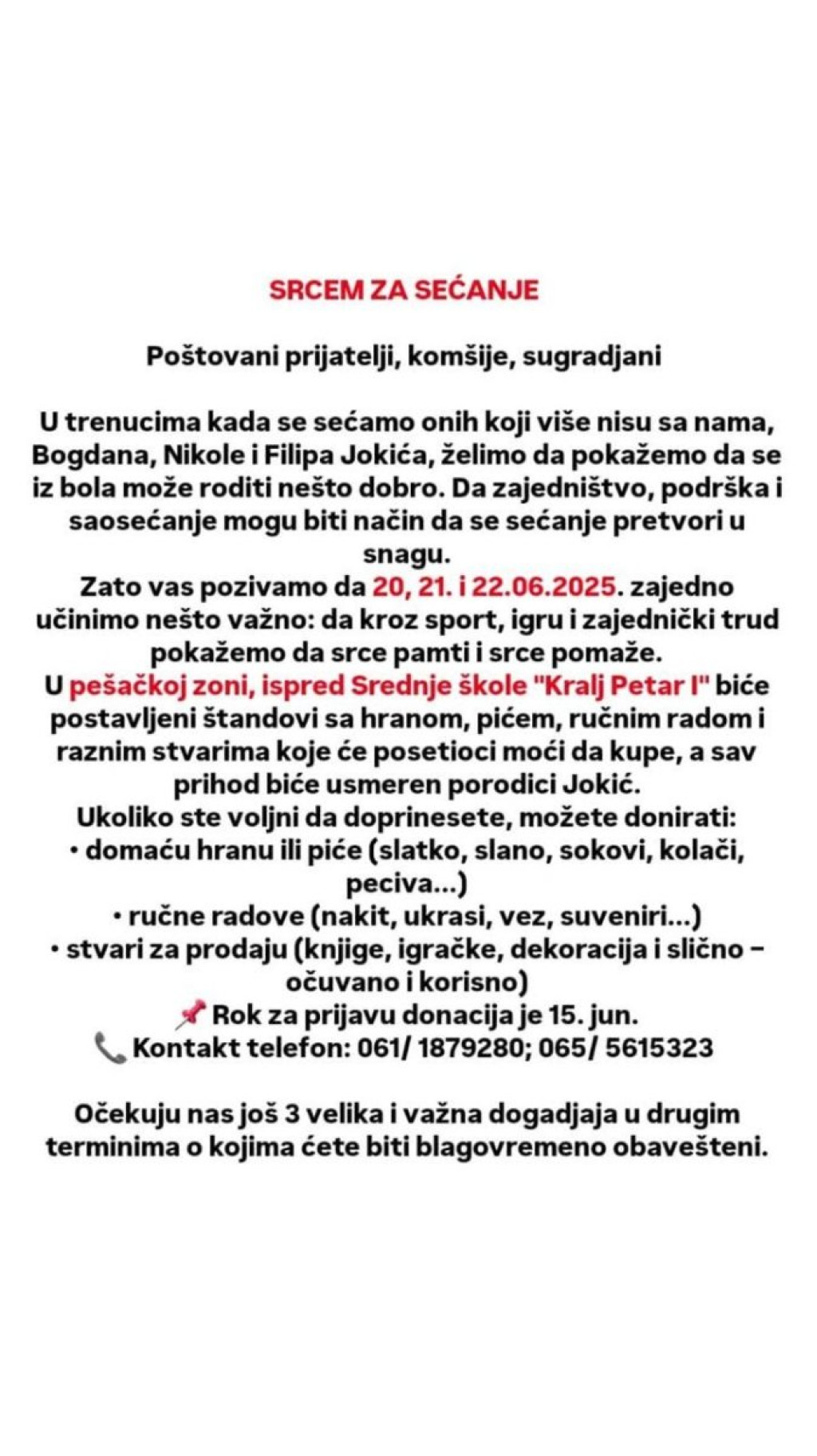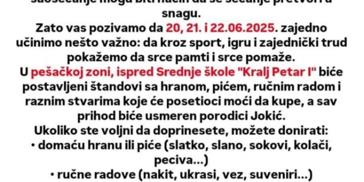 U petak, subotu i nedelju 20. 21. i 22. juna u pešačkoj zoni biće postavljeni štandovi sa hranom, pićem, ručnim radom i raznim predmetima koje će posetioci moći da kupe, a sav prihod biće usmeren porodici Jokić, navodi se u Fejsbuk objavi koja je postavljena i na sajtu opštine Topola.