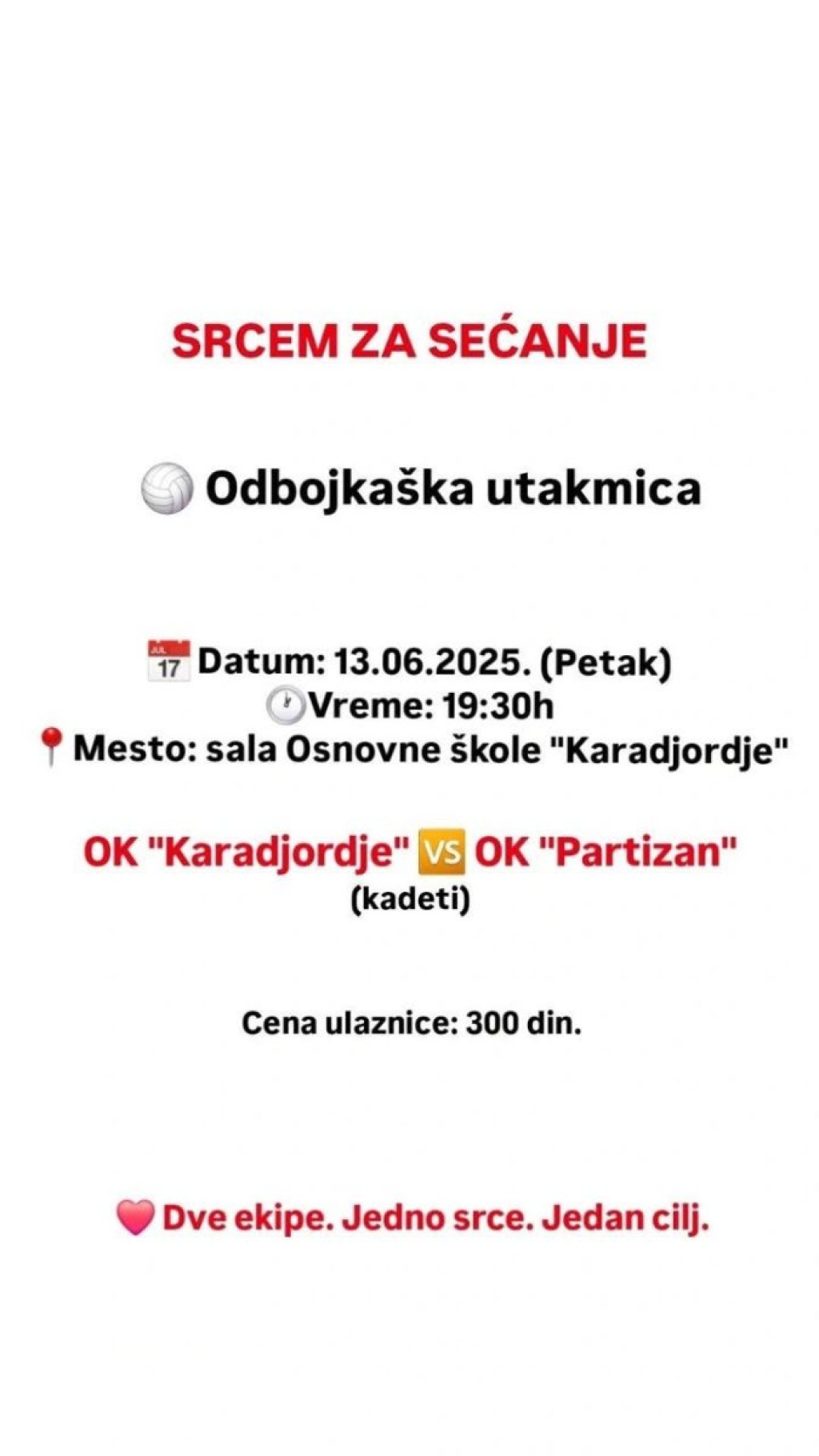 Prva u nizu planiranih aktivnosti je odbojkaška utakmica koja je planirana za petak 13.06. sa početkom od 19:30 u sali Osnovne škole "Karadjordje". Odigraće je odbojkaši Karadjordja i Partizana, a karta za utakmicu koštaće 300 dinara.