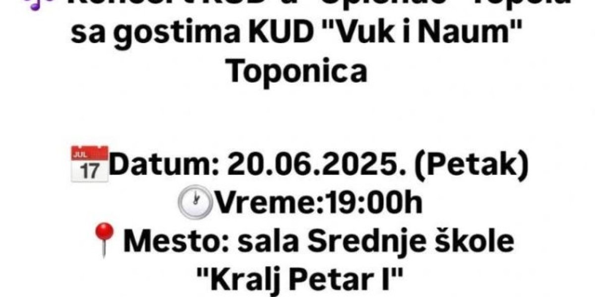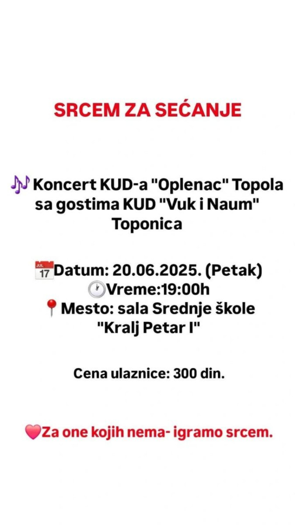Potom će se u petak 20. juna u sportskoj sali Srednje škole okupiti folkloraši, KUD "Oplenac" iz Topole i KUD "Vuk i Naum" iz Toponice. Početak nastupa je u 19:00 časova, a cena ulaznice 300 dinara.