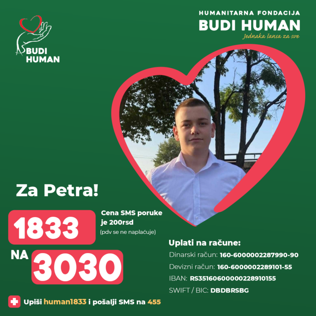 Svi koji žele da pomognu Petru mogu to učiniti uplatom preko platforme BUDI HUMAN, putem SMS poruka, direktnih uplata na namenski račun, kao i deljenjem informacija na društvenim mrežama kako bi apel dosegao što veći broj ljudi. Petar je mladić koji, uprkos teškoj dijagnozi, pokazuje neverovatnu hrabrost i želju za životom. Njegova borba nije samo medicinska - ona je i borba za šansu, za budućnost, za mladost koju nije stigao da proživi kako dolikuje.