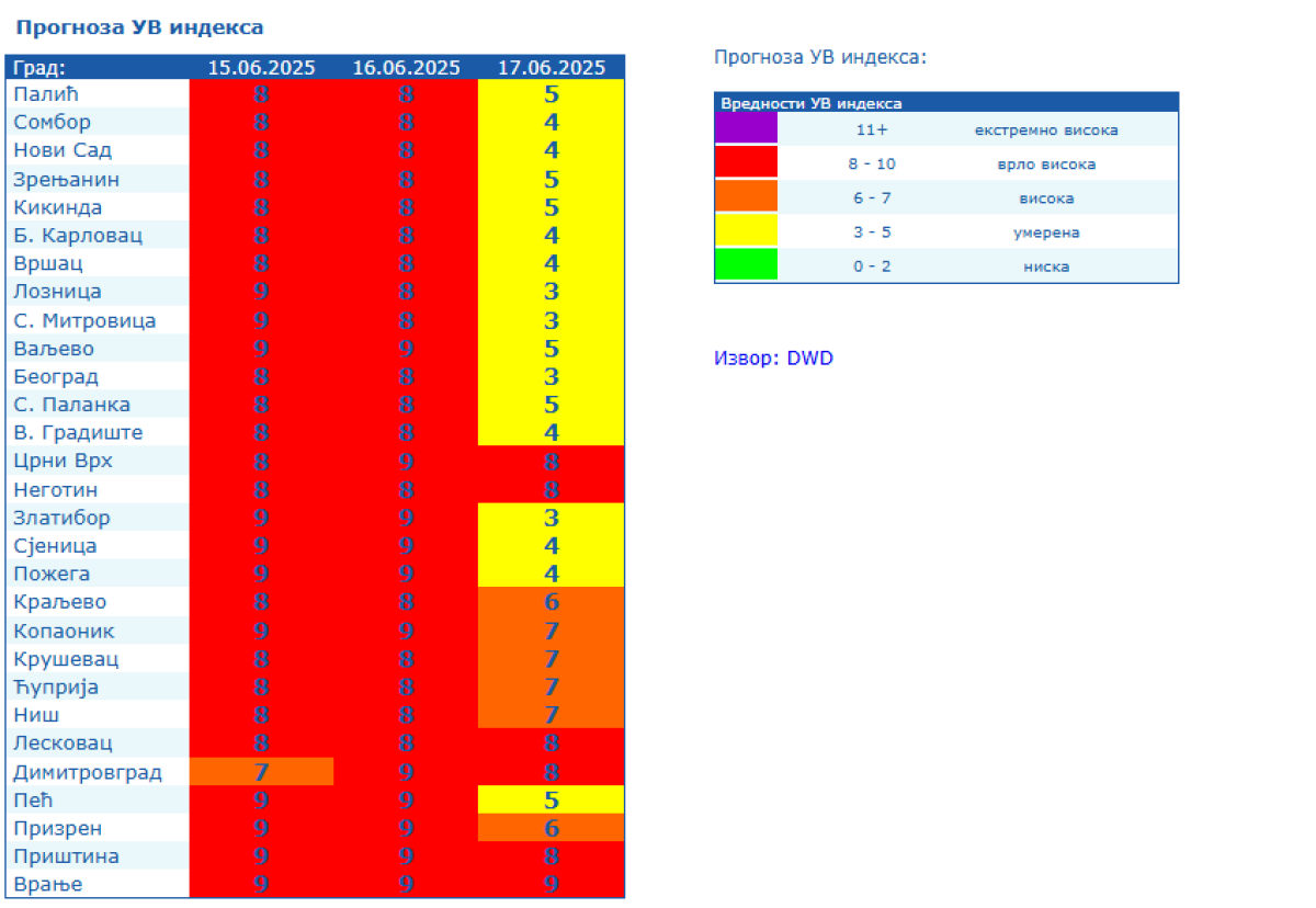 Kako se na sajtu RHMZ može videti, prognozirane vrednosti UV indeksa na svim mernim stanicama kreću se u rasponu od 8 do 9, što znači da je UV zračenje u celoj zemlji vrlo visoko.