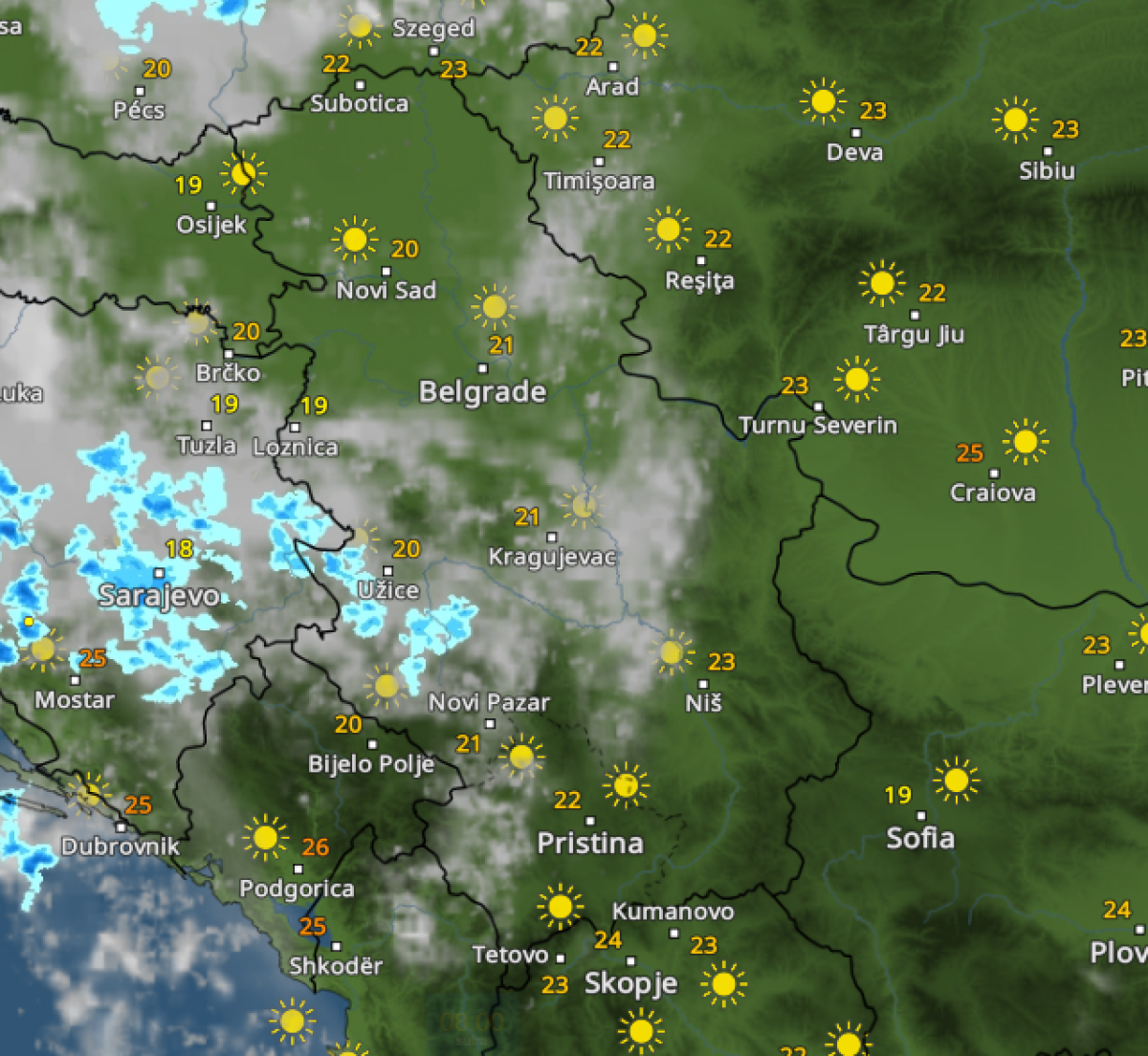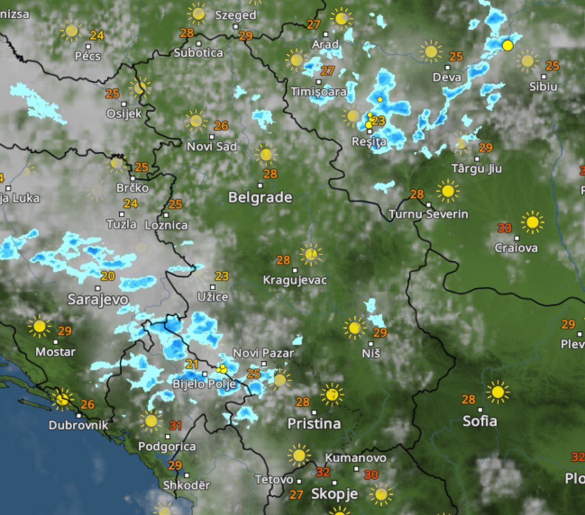 Danas će na istoku i jugoistoku zemlje biti pretežno sunčano i toplo, u ostalim predelima promenljivo oblačno sa sunčanim intervalima i malo svežije, a sredinom dana i posle podne ponegde u Vojvodini, posebno u Banatu, na jugozapadu zemlje, kao i u oblasti Homolja i Kučajskih planina, sa kratkotrajnim lokalnim pljuskovima i grmljavinom, saopštio je Republički hidrometeorološki zavod.