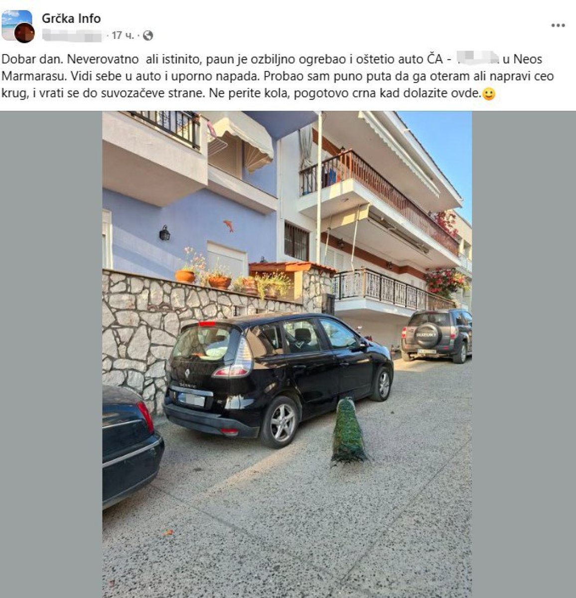 "Dobar dan. Neverovatno ali istinito: paun je ozbiljno ogrebao i oštetio auto u Neos Marmarasu. Vidi sebe u autu i uporno napada. Probao sam puno puta da ga oteram, ali napravi ceo krug i vrati se do suvozačeve strane. Ne perite kola, pogotovo crna kad dolazite ovde." napisao je on u Fejsbuk grupi "Grčka info".