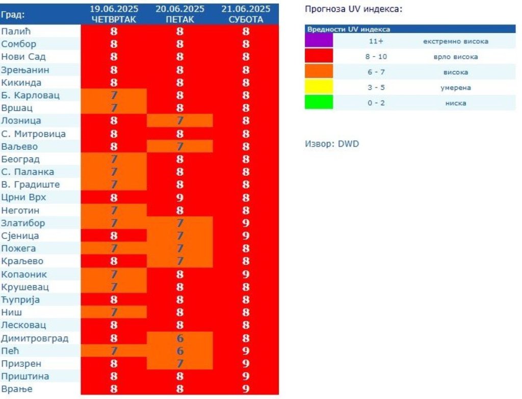 rbija će tokom predstojećih dana biti izložena visokim i veoma visokim vrednostima UV indeksa, prema najnovijem izveštaju Republičkog hidrometeorološkog zavoda (RHMZ), a prognoza za subotu i nedelju ukazuju na značajno povećanje UV indeksa u mnogim gradovima širom zemlje, posebno na jugu zemlje.