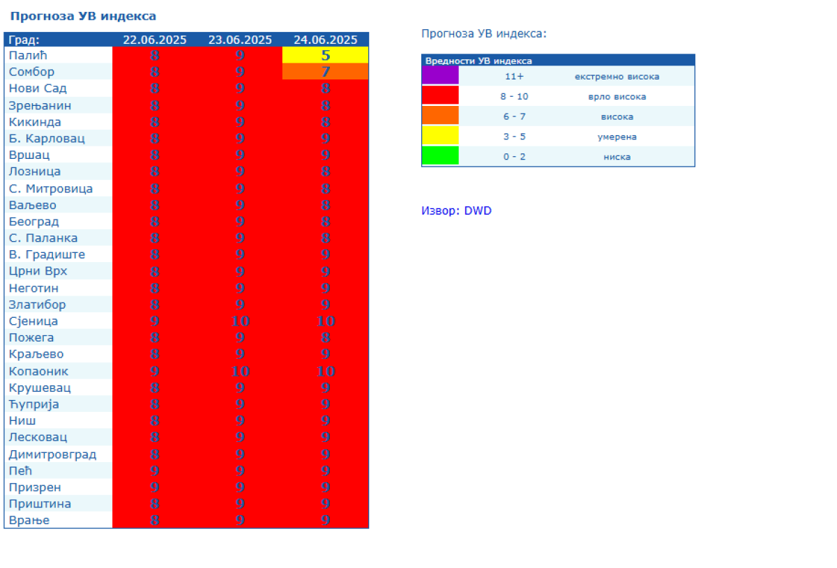 Kako se vidi na tabeli, UV indeks je danas u celoj Srbiji veoma visok i dostići će 9 stepen na skali uv zračenja.