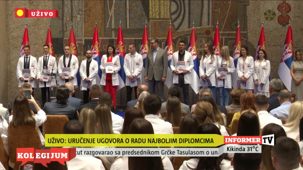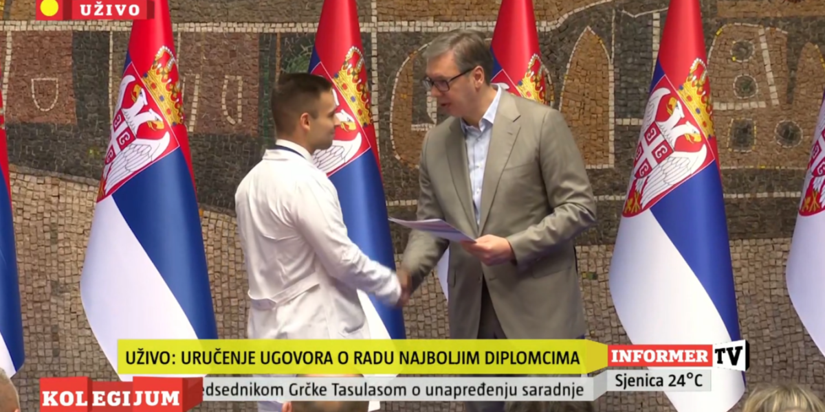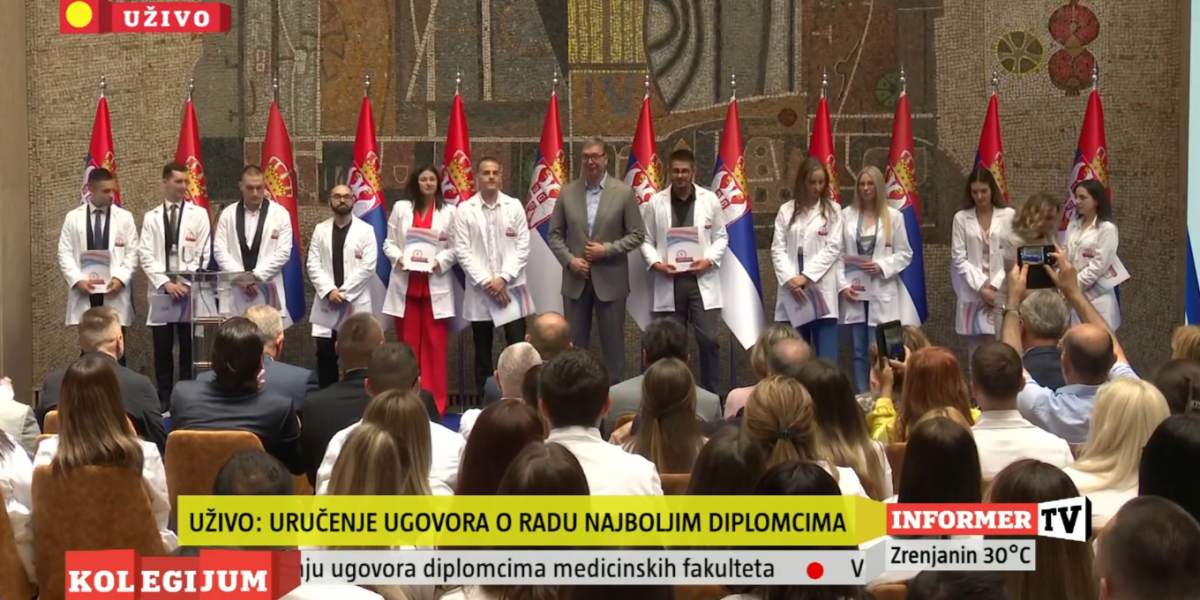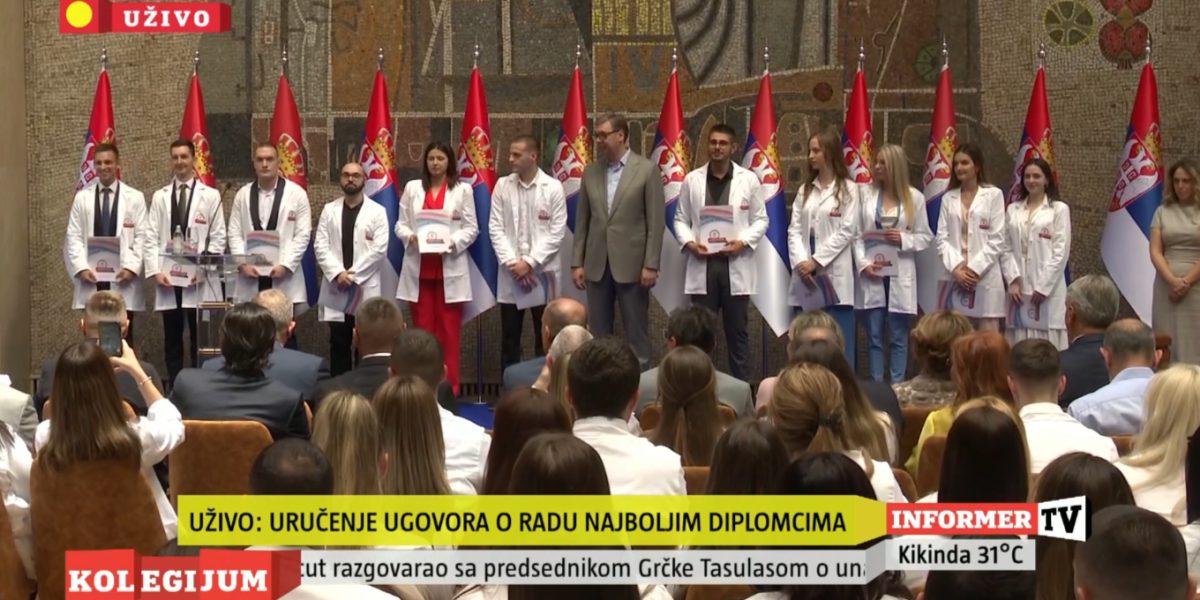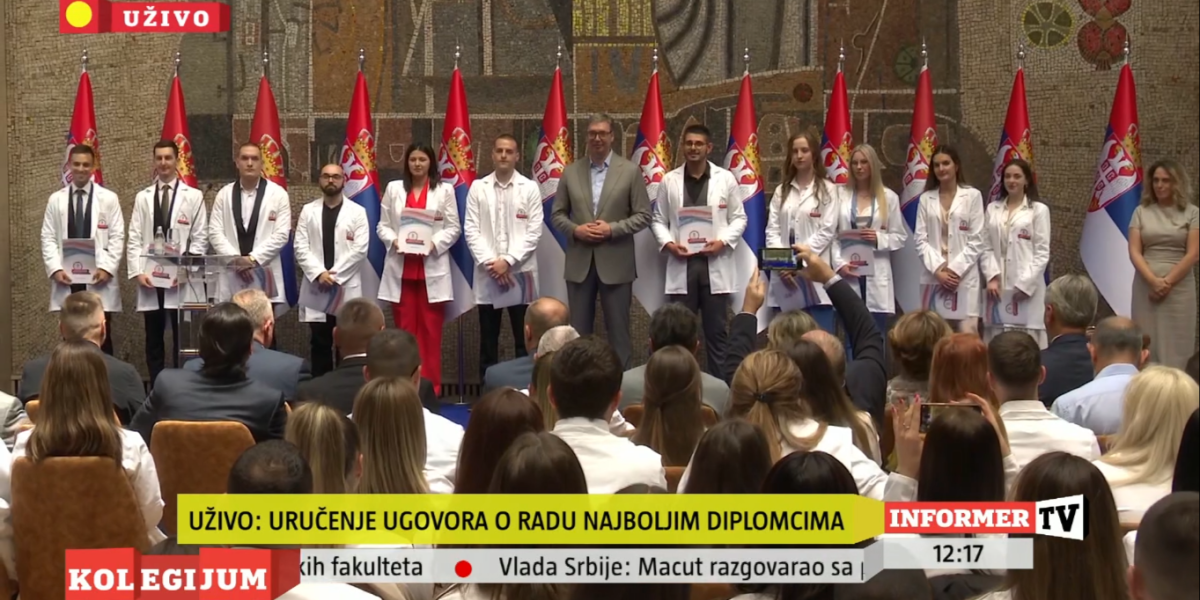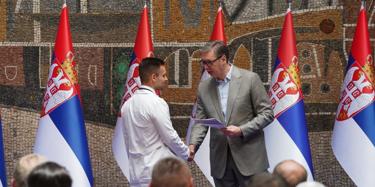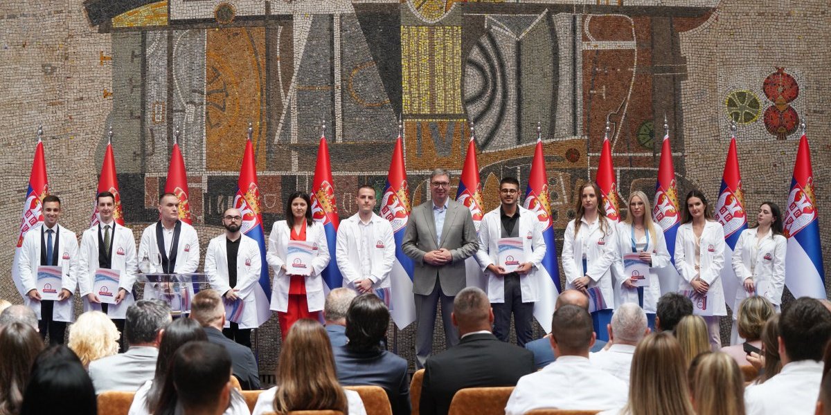 Predsednik Srbije Aleksandar Vučić prisustvovao je ceremoniji uručenja ugovora o radu najboljim diplomcima medicinskih fakulteta i srednjih medicinskih škola u Srbiji.