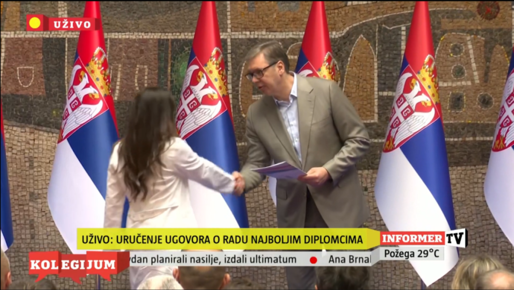 Predsednik Republike Srbije Aleksandar Vučić uručio je ugovore Filipu Miloševiću, Merjam Selmanović, Nemanji Maletinu, Ani Balenović, Milijani Gačević, Ani Ivić, Aleksi Radovanoviću, Ivani Vujinović, Novaku Ristoviću, Mariji Milanović i diplomcu srednje škole Đorđu Ćojbašiću.
