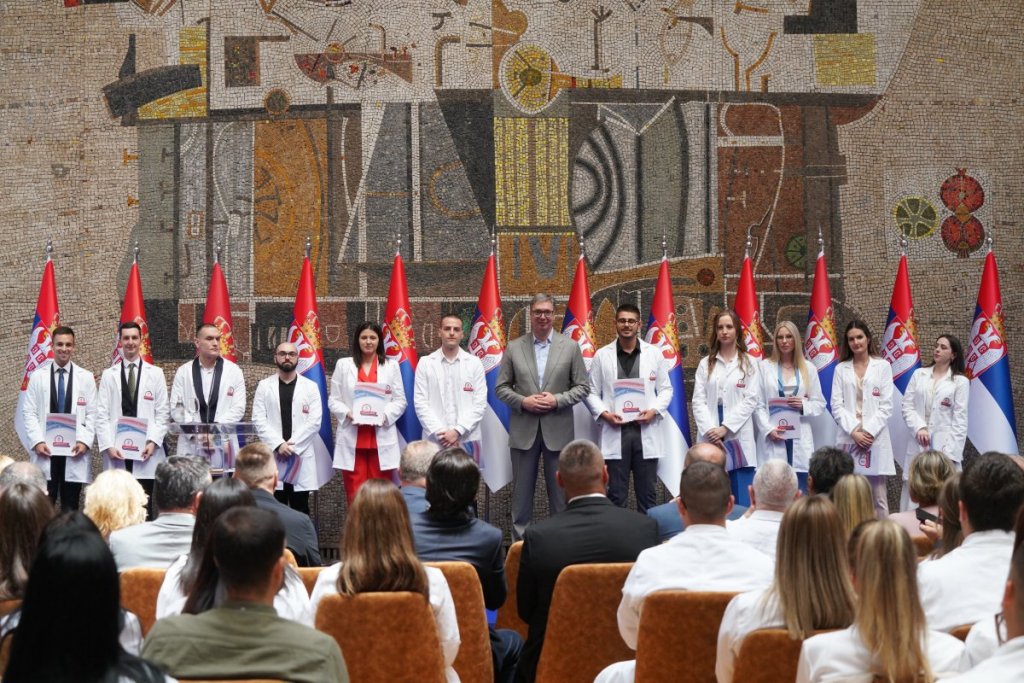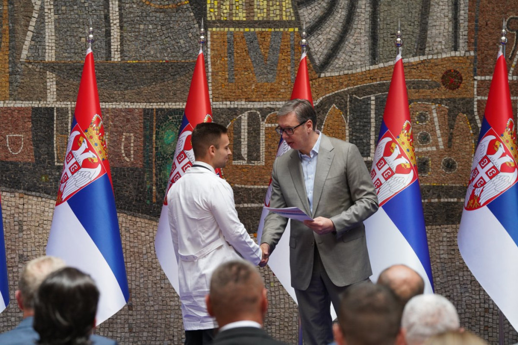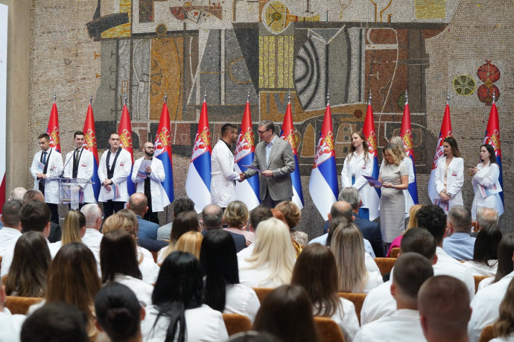 Predsednik Srbije Aleksandar Vučić prisustvovao je prijemu povodom dodele ugovora o radu najboljim diplomcima medicinskih fakulteta i srednjih medicinskih škola u Srbiji.