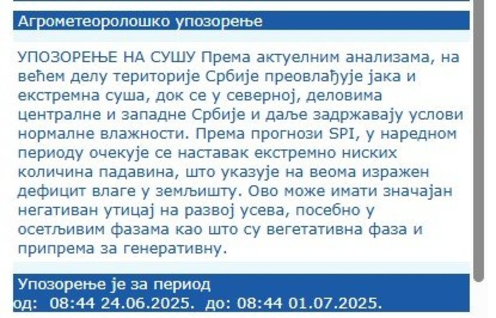 "Prema prognozi SPI, u narednom periodu očekuje se nastavak ekstremno niskih količina padavina, što ukazuje na veoma izražen deficit vlage u zemlјištu. Ovo može imati značajan negativan uticaj na razvoj useva, posebno u osetlјivim fazama kao što su vegetativna faza i priprema za generativnu - navodi se u upozorenju RHMZ na sušu", navode na RHMZ.