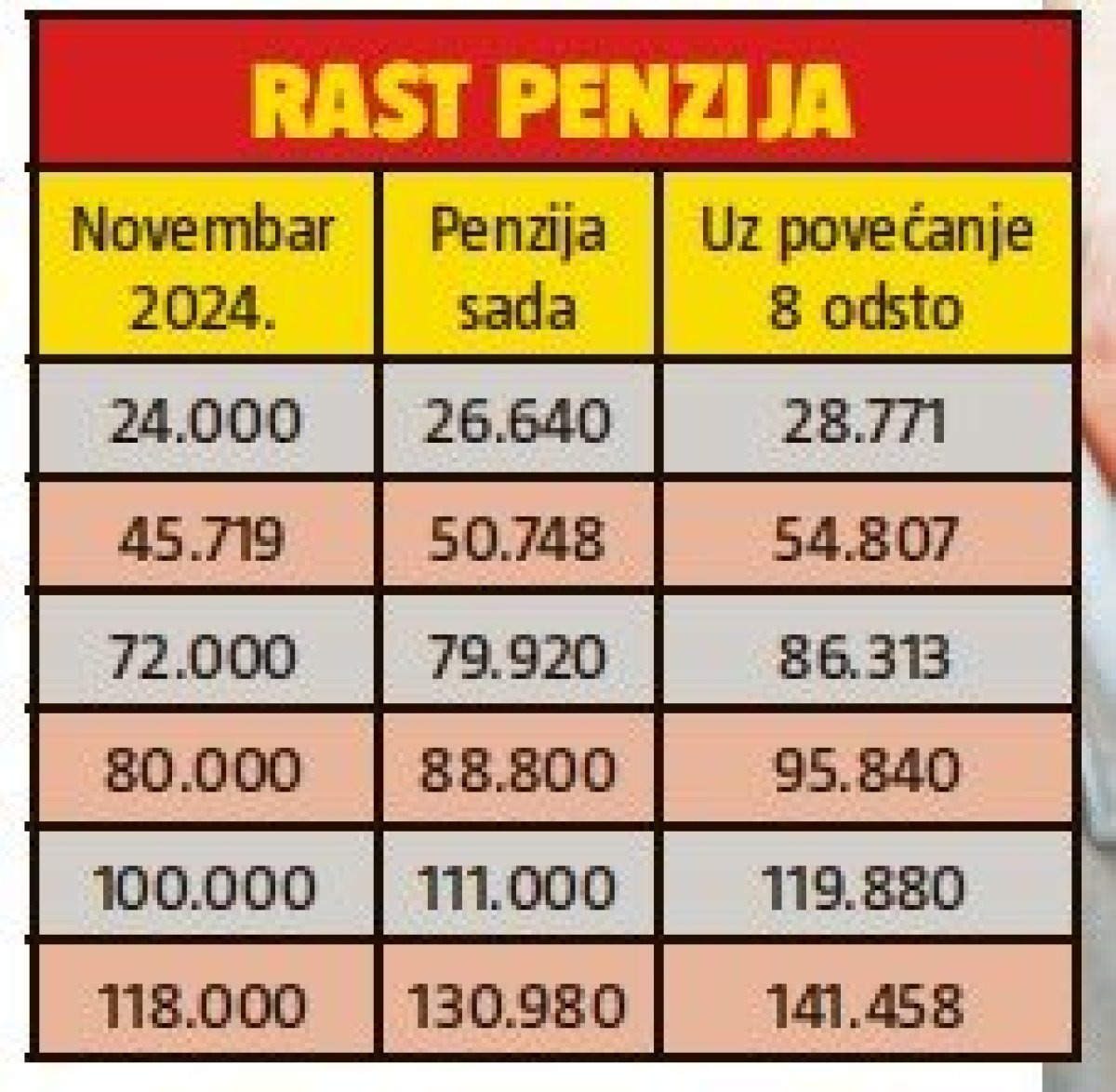 Ukoliko bi se penzije povećale za osam odsto, od 1. novembra bi prosečna penzija iznosila 54.807 dinara. Oni koji sada primaju 88.800 dinara od 1. novembra primaće minimum 95.840 dinara (pogledajte tabelu).