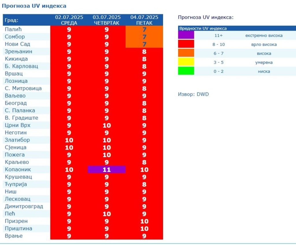 - UV indeks će naredna tri dana biti veoma visok i kretaće se od 7 do čak 11 što spada u ekstremne vrednosti. Vreme moze biti opasno po zdravlje. Posle Kopaonika, veliki UV indeks biće i u Požegi, na Zlatiboru, u Peći, Sjenici - navode u RHMZ.