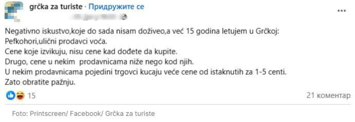 - Negativno iskustvo koje do sada nisam doživeo, a već 15 godina letujem u Grčkoj! Pefkohori, ulični prodavci voća. Cene koje izvikuju, nisu cene kad dođete da kupite. Drugo, cene u nekim prodavnicama niže nego kod njih. U nekim prodavnicama pojedini trgovci kucaju veće cene od istaknutih za jedan do pet centi. Zato obratite pažnju - upozorava Srbin.