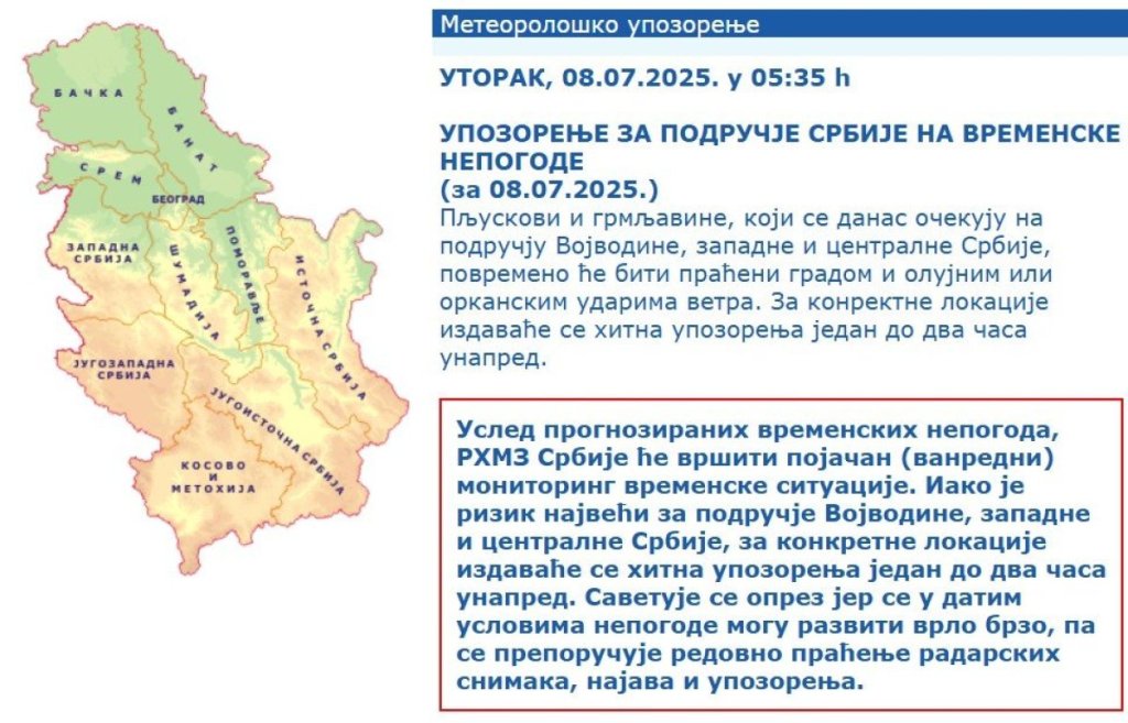 "Tokom dana ćemo izdavati hitna upozorenja za konkretne lokacije i usled prognoziranih vremenskih nepogoda vršiće pojačani, odnosno vanredni, monitoring vremenske situacije", navode u RHMZ.