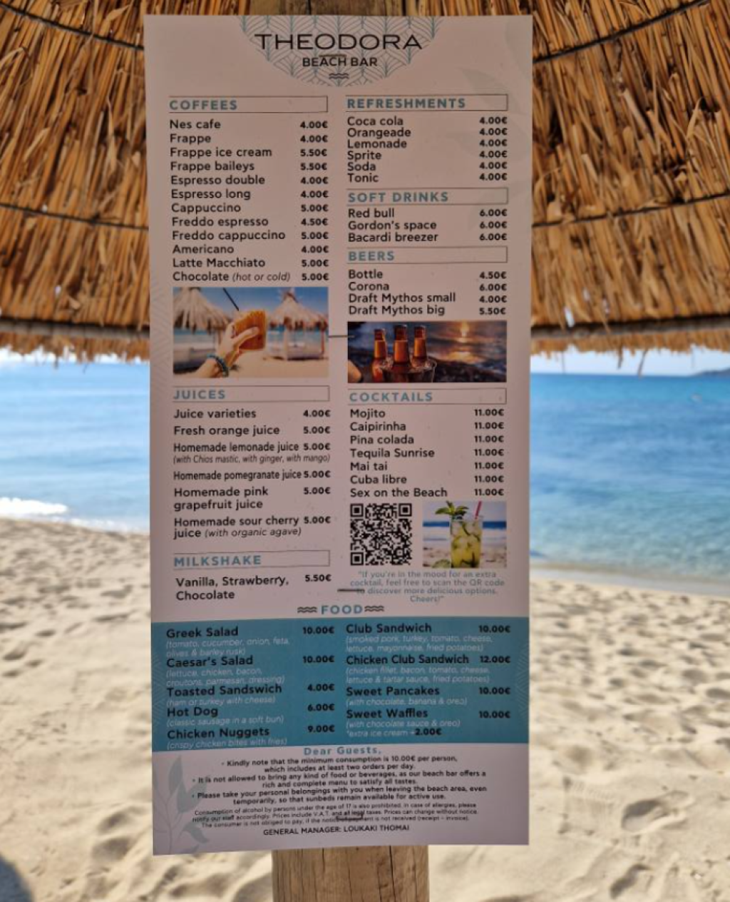 Na "fejsbuk" objavi osvanuo je cenovnik hrane i pića na jednoj od plaža u Sartiju, gde se jasno može videti da je sendvič 12 evra, kafa 4 evra, kapućino 5, koliko je i domaći đus, dok su kokteli čak 11 evra.