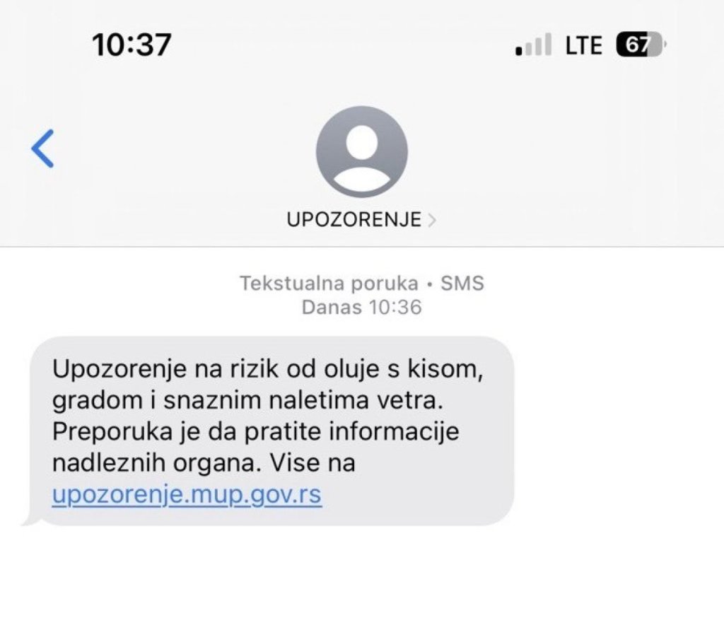 U sms poruci upozorenja napominje se da se očekuje jako nevreme sa olujom, gradom i kišom. Građanima se apeluje da prate instrukcije nadležnih.