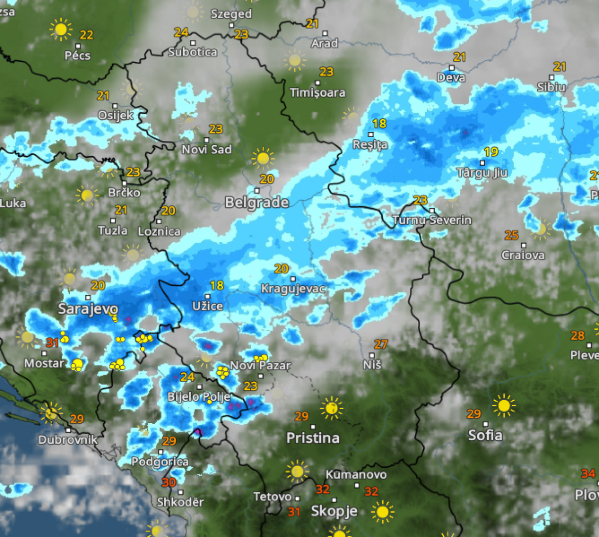 Posle podne na severu očekuje se prestanak padavina, a zatim i postepeno razvedravanje, a u ostalim krajevima mestimično kiša i pljuskovi s grmljavinom, koji će lokalno biti intenzivniji u južnim predelima.
