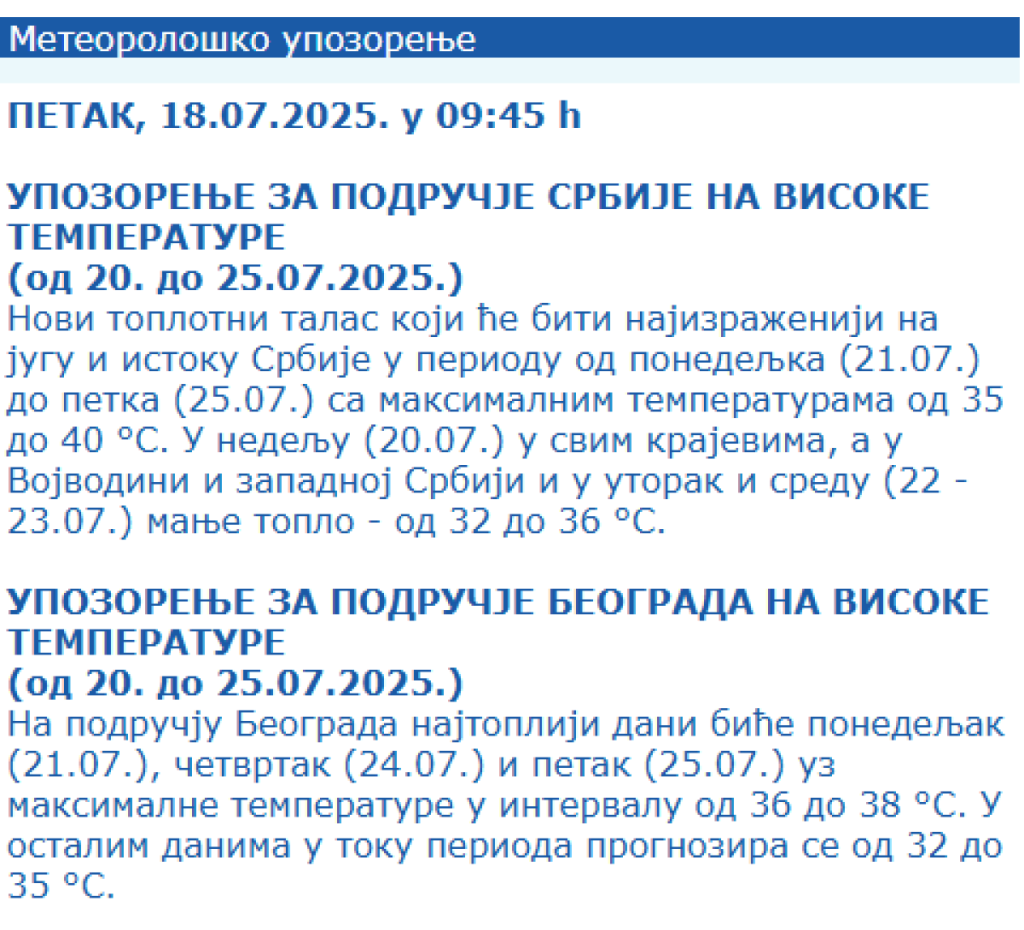 "Novi toplotni talas biće najizraženiji na jugu i istoku Srbije u periodu od ponedeljka do petka sa maksimalnim temperaturama od 35 do 40 stepeni. U nedelju se očekuju visoke temperature u svim krajevima, a u Vojvodini i zapadnoj Srbiji u utorak i sredu nešto manje toplije od 32 do 36 stepeni", objavio je u najnovijoj najavi RHMZ.