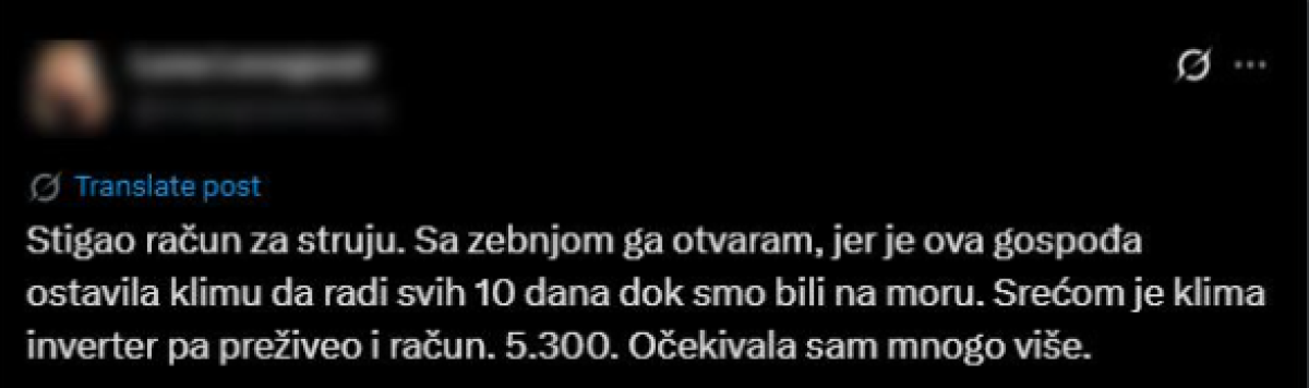 Ova Beograđanka podelila je svoju priču na društvenim mrežama i istakla da je odlučila da ostavi klimu upaljenu dok je na odmoru, a kada je stigao račun za struju iznosio je svega 5.300 dinara.