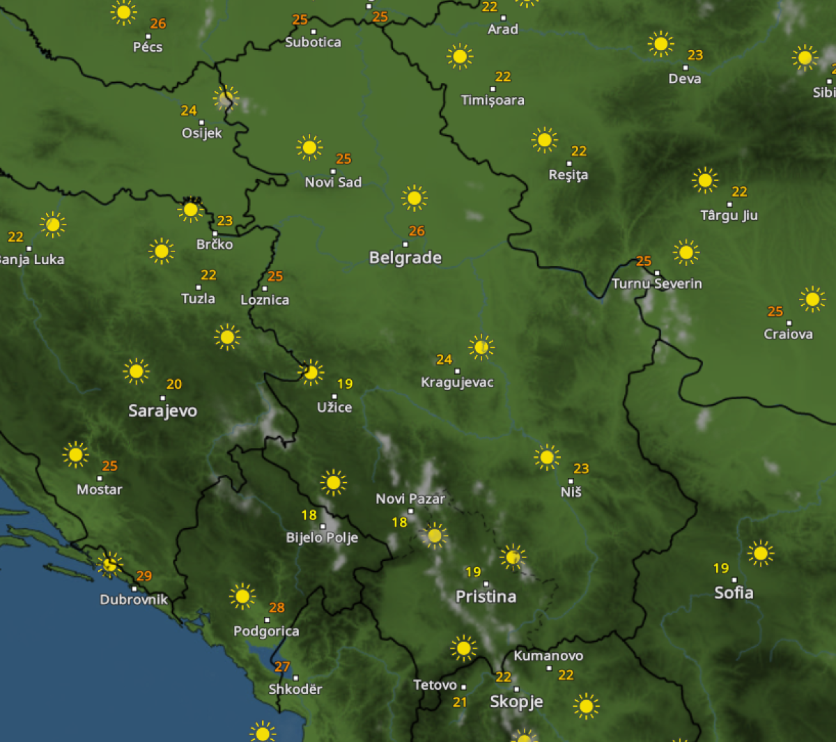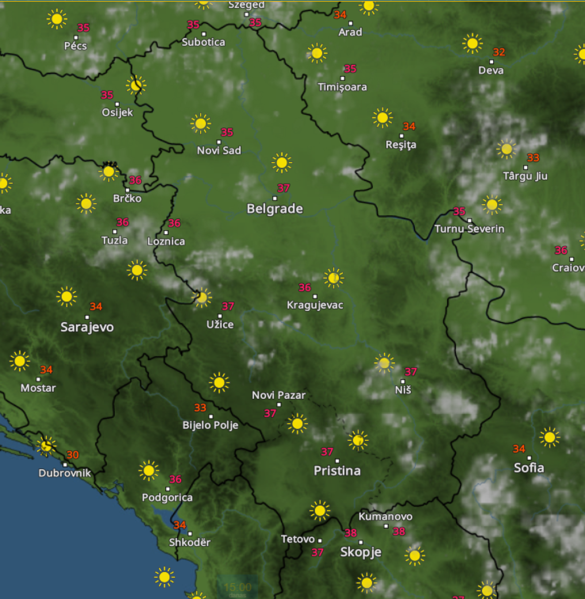 Tokom dana očekuje se porast temperature i pik toplotnog talasa, a prema prognozi najtoplije će biti u Beogradu, Užicu, Nišu i Novom Pazaru gde će temperatura dostići 37. podeok.