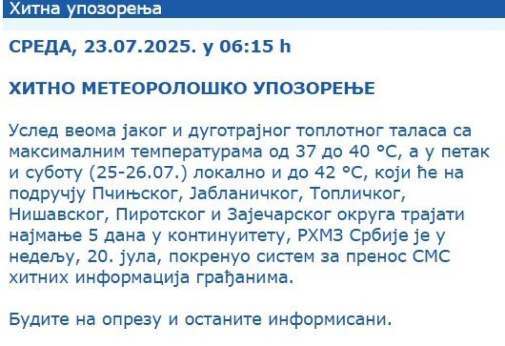 - U petak i subotu 25 i 26. jula lokalno će biti i do 42 stepena. Na području Pčinjskog, Jablaničkog, Topličkog, Nišavskog, Pirotskog i Zaječarskog okruga trajaće najmanje 5 dana u kontinuitetu. Zato je 20. jula, pokrenut sistem za prenos SMS hitnih informacija građanima - napominju u RHMZ.