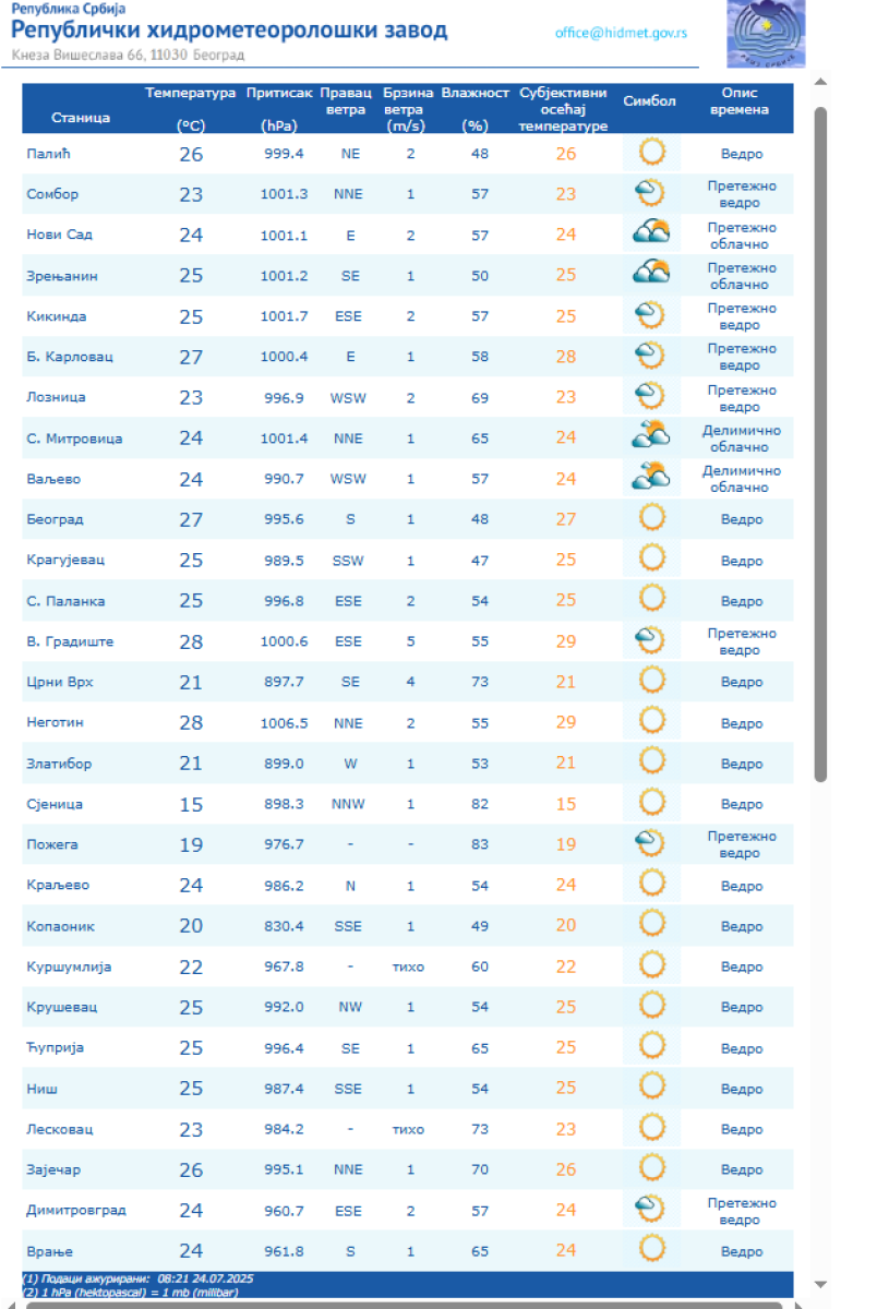 Prema sadašnjim merenjima najtoplije je u Velikom Gradištu i Negotinu gde je zabeležena temperatura od 28 stepeni Celzijusa, a nakon ovih gradova najvišu temperaturu beleži Beograd sa 27 stepeni.