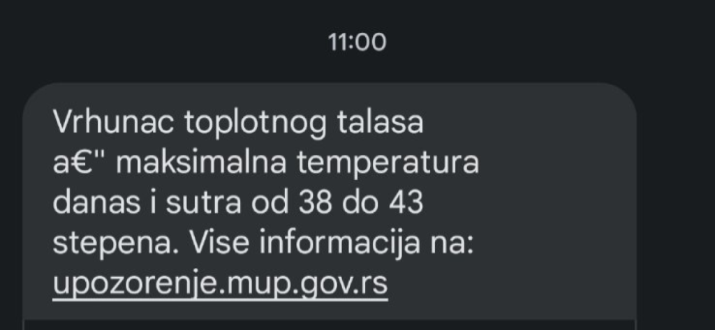 Kako se navodi u poruci, zbog vrhunca toplotnog talasa maksimalna temperatura za danas i sutra dostizaće i do 43 stepena. Na sajtu MUP-a, objavljena su uputstva za građane koji uključuju opasnost po zdravlje, rizik od toplotnog udara i dehidratacije, opasnost od lakog iniciranja i širenja vatre, ali i savet da se izbegava boravak na otvorenom.