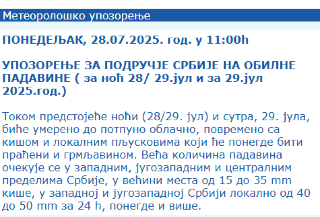 "Tokom predstojeće noći i sutra, 29. jula, biće umereno do potpuno oblačno, povremeno sa kišom i lokalnim pljuskovima koji će ponegde biti praćeni i grmljavinom. Veća količina padavina očekuje se u zapadnim, jugozapadnim i centralnim predelima Srbije, u većini mesta od 15 do 35 mm kiše, u zapadnoj i jugozapadnoj Srbiji lokalno od 40 do 50 mm za 24 h, ponegde i više", navodi se u saopštenju RHMZ-a.