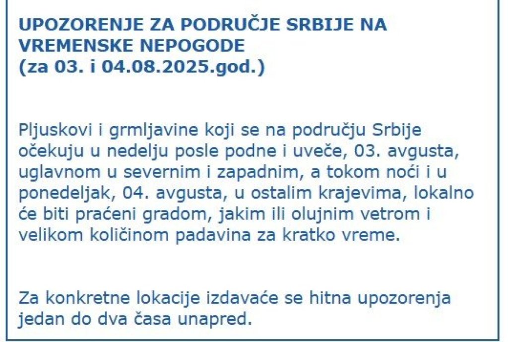 Prema navodima RHMZ, plјuskovi i grmlјavine koji se na području Srbije očekuju u nedelјu posle podne i uveče, 03. avgusta, uglavnom u severnim i zapadnim, a tokom noći i u ponedelјak, 04. avgusta, u ostalim krajevima.