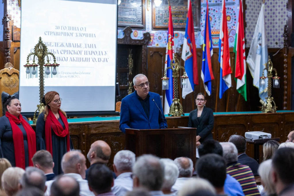 Izložbom "Kultura pamćenja: Fotografije – zločinačka akcija "Oluja"", na platou na Trgu republike ispred svečanog ulaza u Gradsku kuću, obraćanjima predsednika Saveza srpskih udruženja Severnobačkog okruga, Miroslava Karana, upravnice subotičkog ogranka Fondacije "Svetozar Miletić“ iz Novog Sada, Ljubice Bertović, gradonačelnika Subotice Stevana Bakića i srpskog režisera i književnika Dragoslava Bokana, kao i uručenjem "Pakračke gramate", u okviru tribine održane u Velikoj većnici Gradske kuće, sinoć je u Subotici obeležena 30. godišnjica stradanja srpskog naroda u zločinačkoj akciji "Oluja".