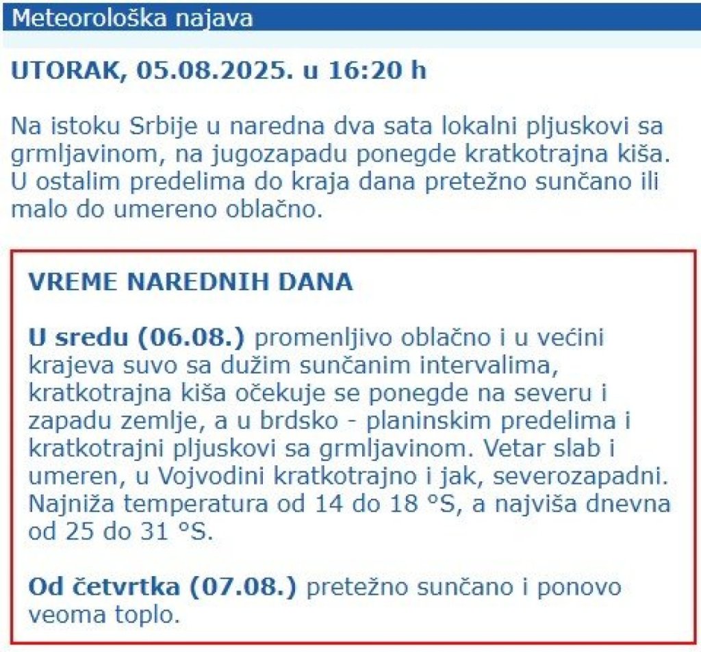 - Što se tiče vremena sutra, očekuje nas promenlјivo oblačno i u većini krajeva suvo sa dužim sunčanim intervalima, kratkotrajna kiša očekuje se ponegde na severu i zapadu zemlјe. Samo će u brdsko - planinskim predelima biti i kratkotrajni plјuskovi sa grmlјavinom. Vetar slab i umeren, u Vojvodini kratkotrajno i jak, severozapadni. Najniža temperatura od 14 do 18 stepeni, a najviša dnevna od 25 do 31 - kažu u RHMZ.