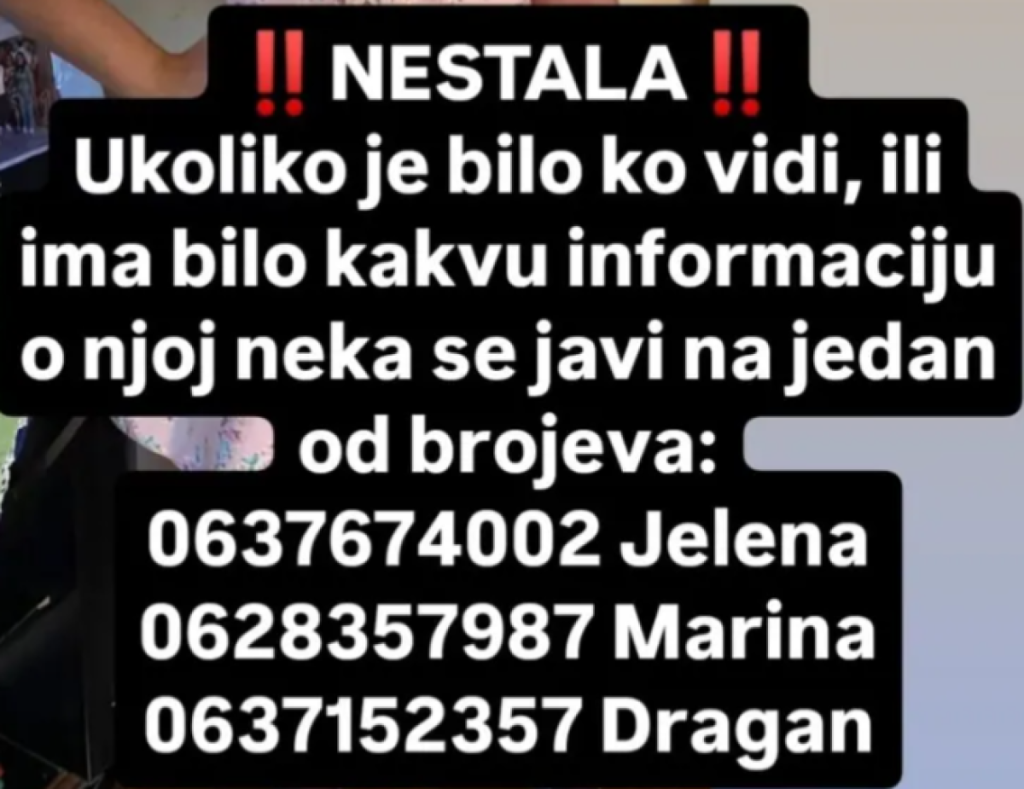 Ivana Jovanović u trenutku nestanka na sebi je imala crne helanke i crno zelenu trenerku, visoka je oko 160 centimetara, ima crnu kosu i braon oči. Ako je vidite odmah pozovite policiju!